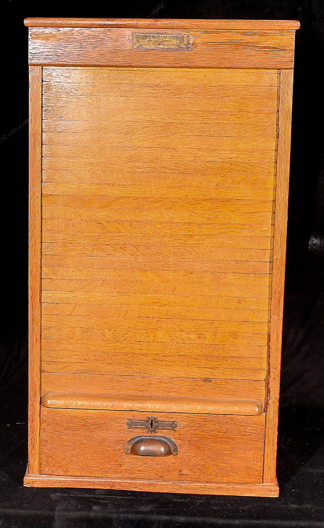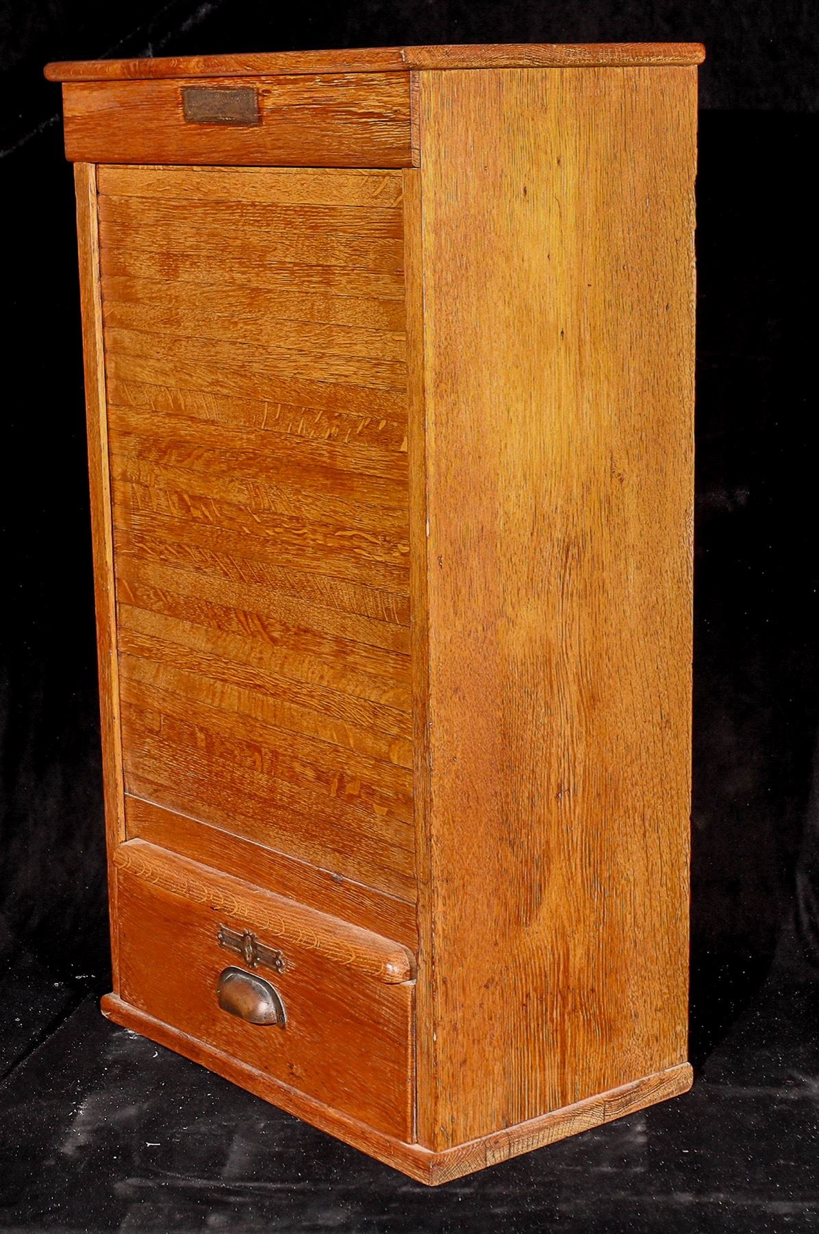 Lockable railroad ticket cabinet made by the National Ticket Case Company of quartersawn white oak with a roll-top tambour front and single-drawer bottom. Cabinet is currently locked. On the back is original shipping label in black paint: // St Louis and SF Railroad, Springfield MO //. 11.5 x 18 x 32.5 inches, c1890s. See photo for details.