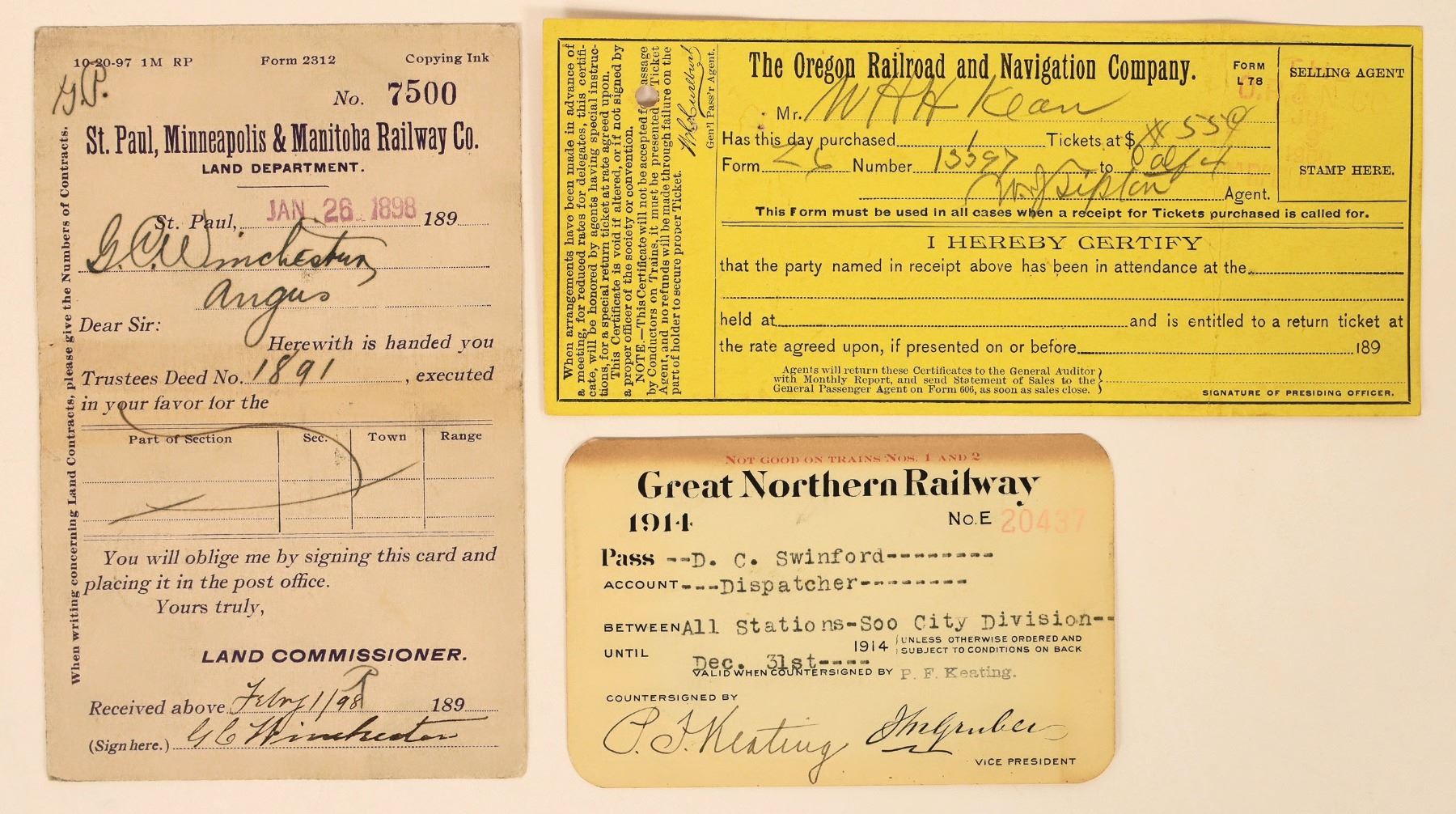 1. Ticket purchase The Oregon Railroad and Navigation Co. 1900. 2. Pioneer era post card to Great Northern Railway Co stamped 1898 from St. Paul, Minneapolis & Manitoba Railway Co.. 3. Great Northern Railway 1911 employee time pass #E16380 and pass #E20437 for all stations. issued to D C Swinford 1914. Exc. cond and in protective sleeves.