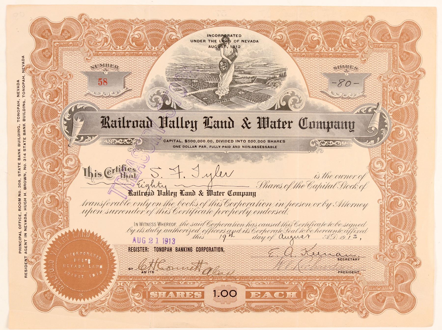 Inc. in Nevada, 1912. No. 58, issued for 80 shares to S.T. Tyler on Aug. 21, 1913. Signed by president Richardson and secretary E.A. Keeman. Not cancelled. Brown border and seal, black print. Vignette of woman with horn of plenty floating above farm lands. Principal Office in Tonopah. Pinholes, folds, toning. 8.5 x 11" Railroad Valley is in Nye County about 50 miles southwest of ELy. Oil was discovered in the early 1900s but production didn't start until the late 1920s. This company may have acquired land and water rights in hopes that a small town would spring up from oil discoveries. Secretary Keenan was also the secretary of the Railroad Valley Company, which formed to drill for potash deposits in 1912. Ken Prag Collection