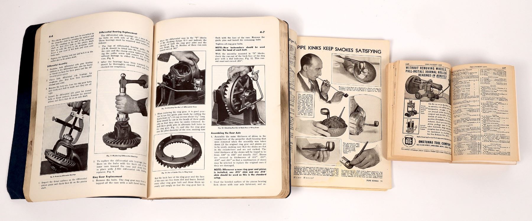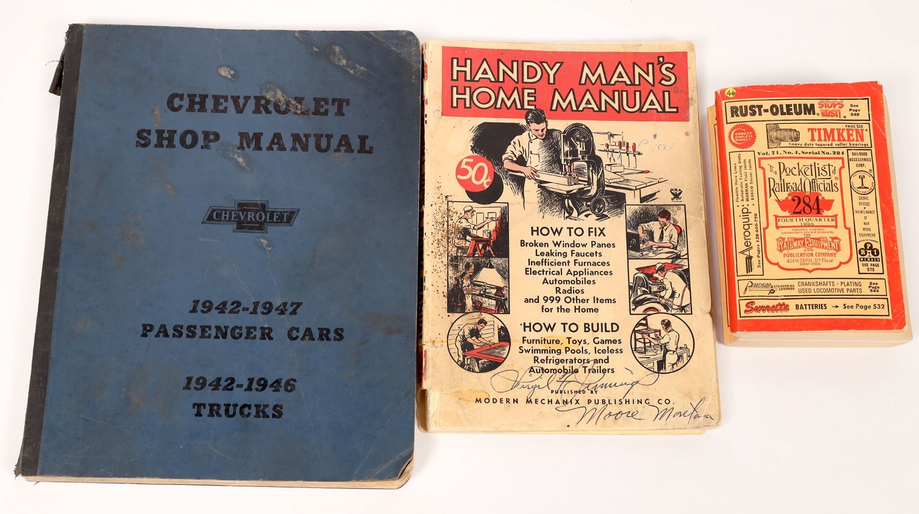 The Pocket List of Railroad Officials, 1935 Handyman's Home Manual-cover detaching and has front writing, 1942-47 Chevrolet Shop Manual. 1965