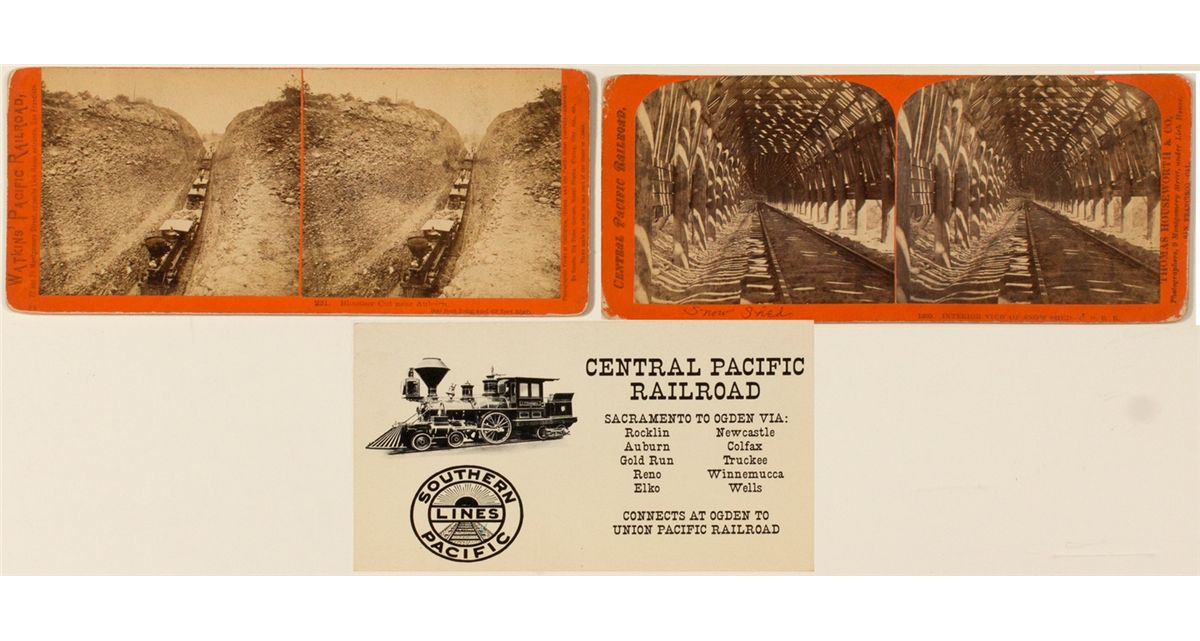 Two stereoviews: boomer cut near Auburn and snow sheds and a central pacific railroad postcard.