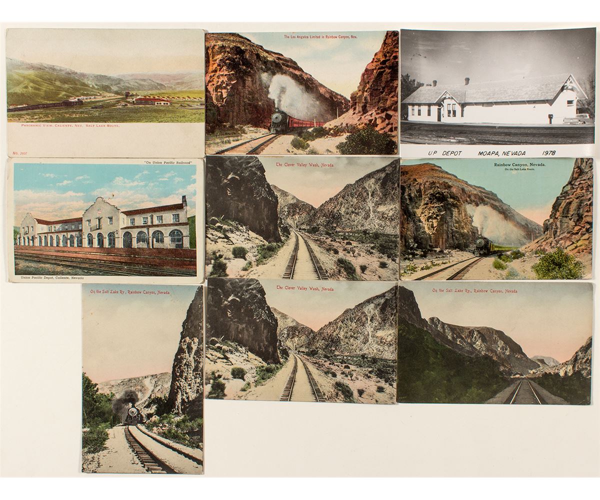 This is a great lot of 9 post cards from all over Nevada. Four from Rainbow Canyon that show either the tracks or a large locomotive moving through. There are two post cards that show the railroad tracks of Clover Valley. Two post cards show the Union Pacific Depot and train in route in Caliente. Lastly, one post card showing the U.P. Depot in Moapa, dated 1978.
