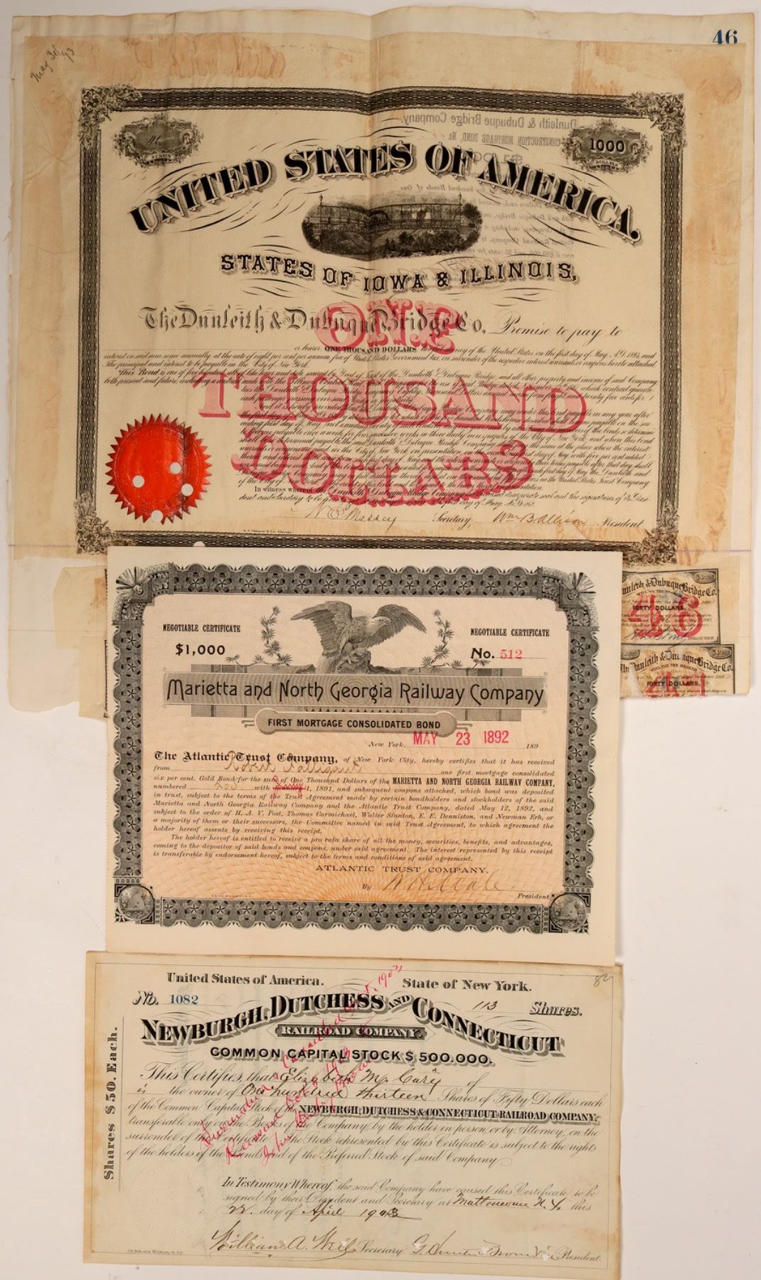 3 certificates. 1. The Dunleith & Dubuque Bridge Co. #46 of 500 issued, I.C, $1000, Construction bond issued May 1862. Signed Wm. B. Allison president. Black, red seal, vignette train l-r over bridge. ONE THOUSAND DOLLARS red underprint. 10 coupons attached. Mounted for preservation. E.S. Skinner & Co printer 2. Marietta and North Georgia Railway Co. . #512, I/U, $1000, Negotiable Certificate, issued 1892. Black, eagle vignette, orange underprint. A.B. king printer. EF 3. Newburgh, Dutchess and Connecticut Railroad Co. #1082, I.C, common stock issued April 1903. signed V.P and Sec. Black, no vignette , embossed seal. J.S. Babcock printer.
