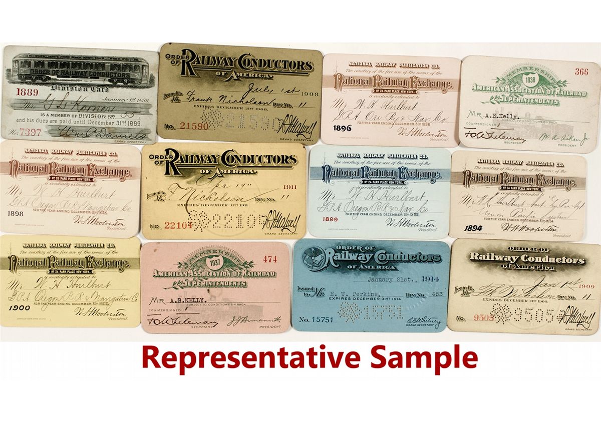 Lot of 27. 1) Five passes for "free use of the rooms" of the National Railway Exchange in New York (1894, 1896, 1898, 1899, and 1900). 2) Nine membership cards for the Order of Railway Conductors (1889 w/ fabulous vignette, 1908-1910, two 1911, 1912, 1913, and 1914). 3) Thirteen membership cards for the American Association of Railroad Superintendents with vignette (1928, 1929, 1930,1932-1935, 1937-1941, and 1943, all issued to A.B. Kelly). Prag Collection