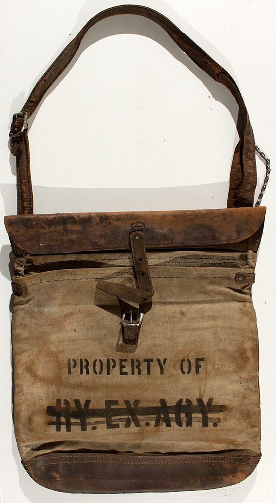 Non- locking. Leather maker is Jos. Kantor in Chicago. Canvas stamped: "PROPERTY OF RY. EX. AGY." (RY. EXP AGY. crossed out). 15" x 15" Heavily used. Stains to canvas and finish wearing off of leather. (Ex-Parker Lyon Pony Express Museum)