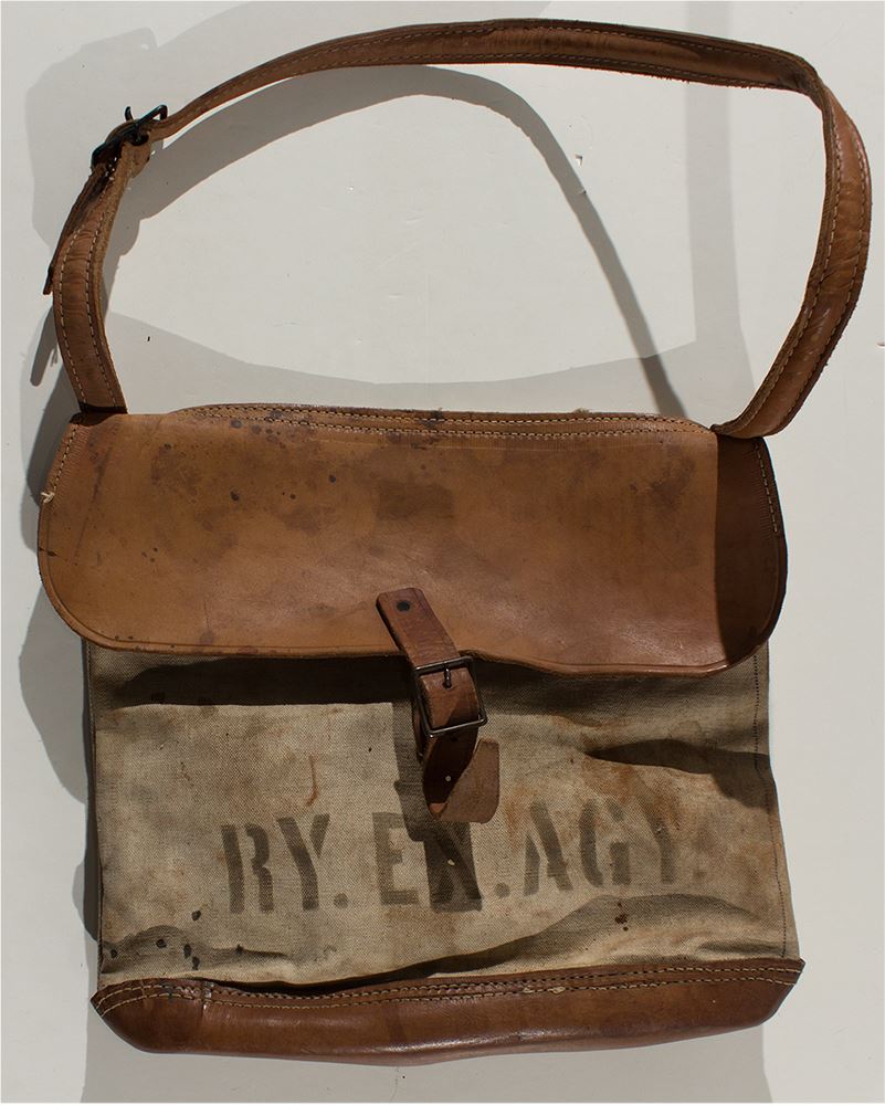 Non-locking. Canvas with leather top and wide bottom. Canvas stamped: "RY. EX. AGY." 13" x 15" Stains to canvas. (Ex-Parker Lyon Pony Express Museum)