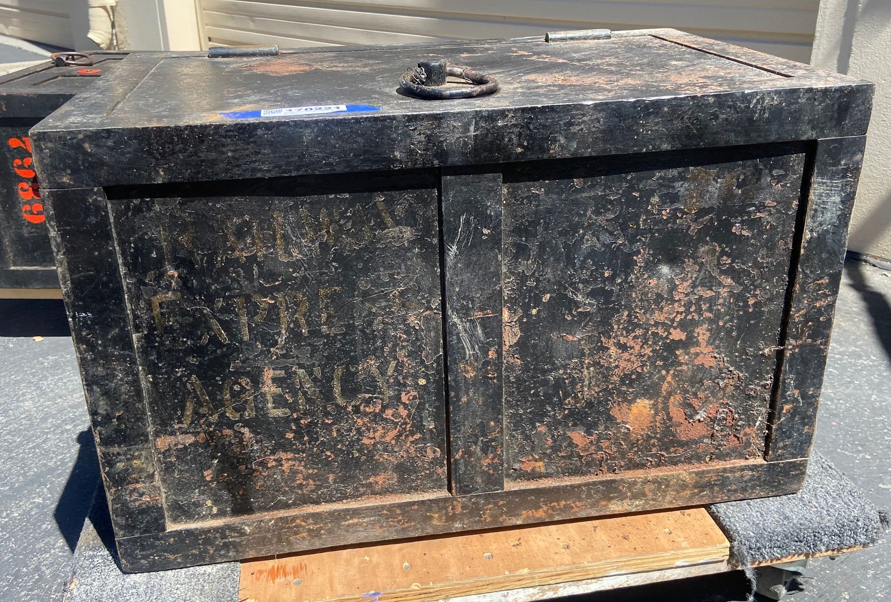 Large railway express strong box made from sheet and cast iron and measures 16" x 16"x 26". This one is locked and we have no key, Who knows what might be inside?