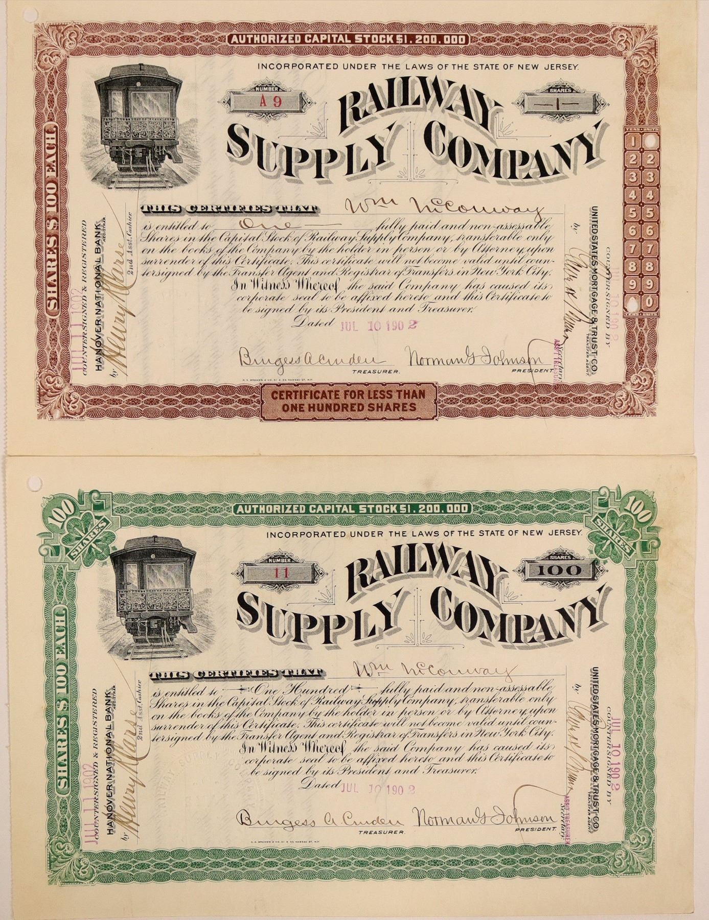 2 certificates. Incorp. New Jersey (unknown year). Both I/U, shares $100 par issued July 10, 1902, embossed seal, vignette top left frontal railroad car. H.K. Brewer & Co printer. Signed Norman G. Johnson president. #A9 for One share, Brown border. #11 for 100 shares, Green border. EF