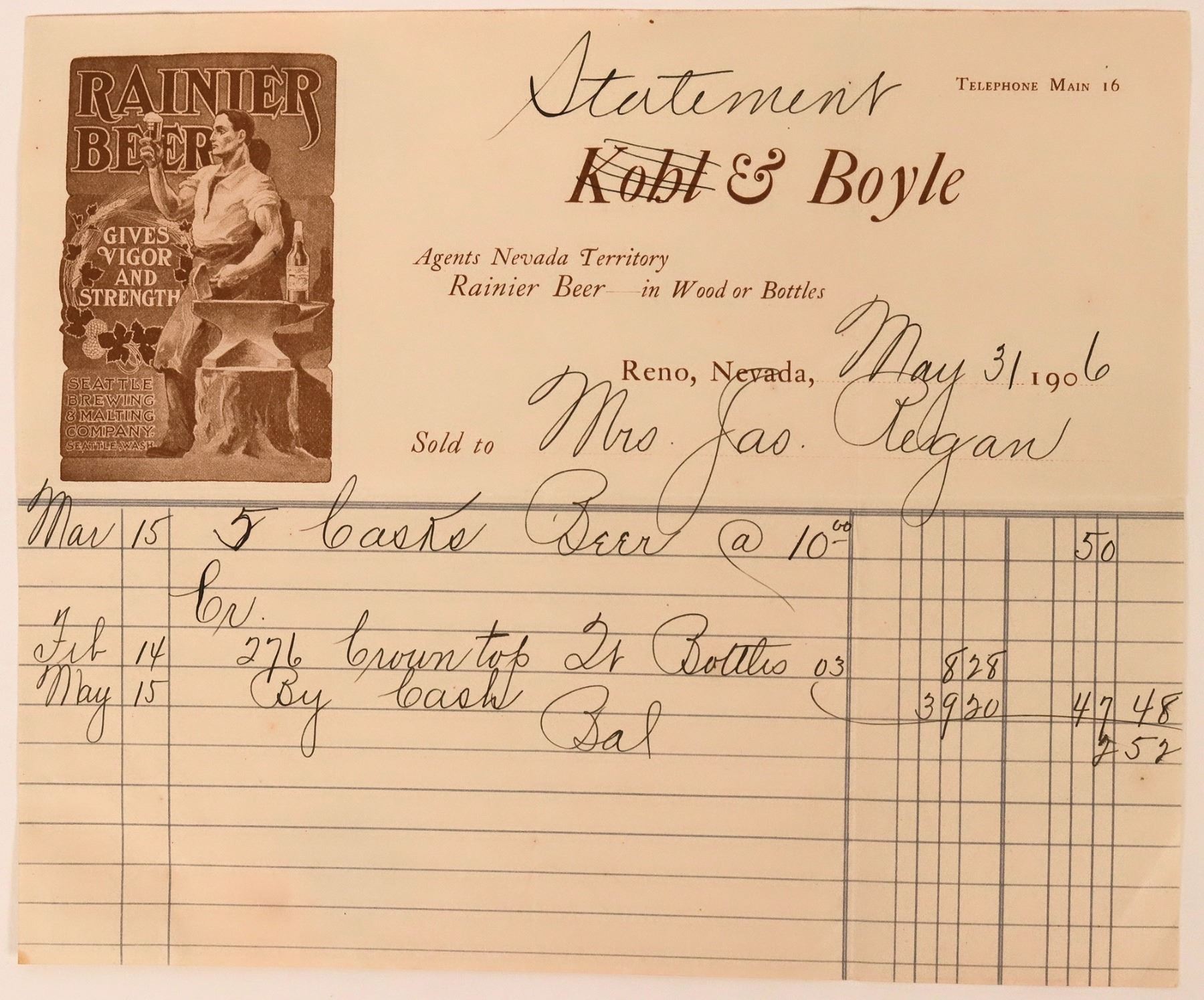Color pictorial billhead for Kohl & Boyle (Kohl crossed out), Agents Nevada Territory Rainier Beer in Wood or Bottles. Dateline Reno, Nevada, May 31st, 1906. Billed to Mrs. Jas. Regan for 5 casks beer and countertop bottles. Vignette advertising at upper left shows man holding up glass of beer: "Rainier Beer, Gives Vigor and Strength, Seattle Brewing & Malting Company, Seattle, Washington." Folds. Rainier Beer was created in 1878 in Seattle. The Rainier Bottling Works and Brewery started in Reno in 1905 at 318 Spokane St. on the north side of downtown, managed by E. T. Herrick. Likely closed down with Prohibition. [For more info., see Volume One of the Nevada Bottle Book]