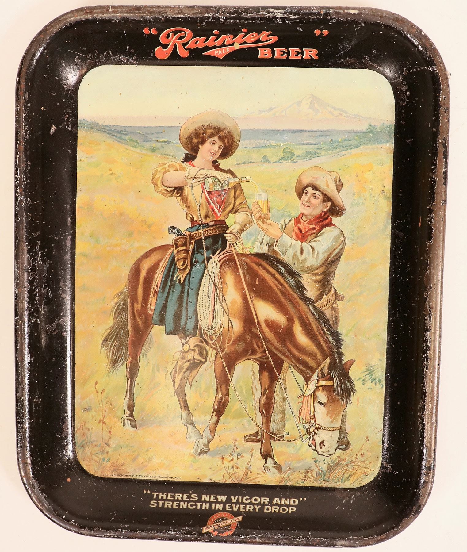 This beer tray measures 13.25 in. X 10.5 in. and shows heavy edge wear but the image is quite good. It depicts a cowgirl pouring a beer into a cowboys beer mug. The border is "Rainier Pale Beer/ there's new vigor and strength in every drop". Pre-prohibition, in good condition. Seattle Washington