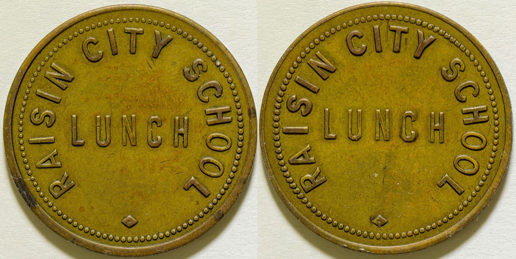 Br., rd., 28 mm. Both sides: "Raisin City School Lunch".