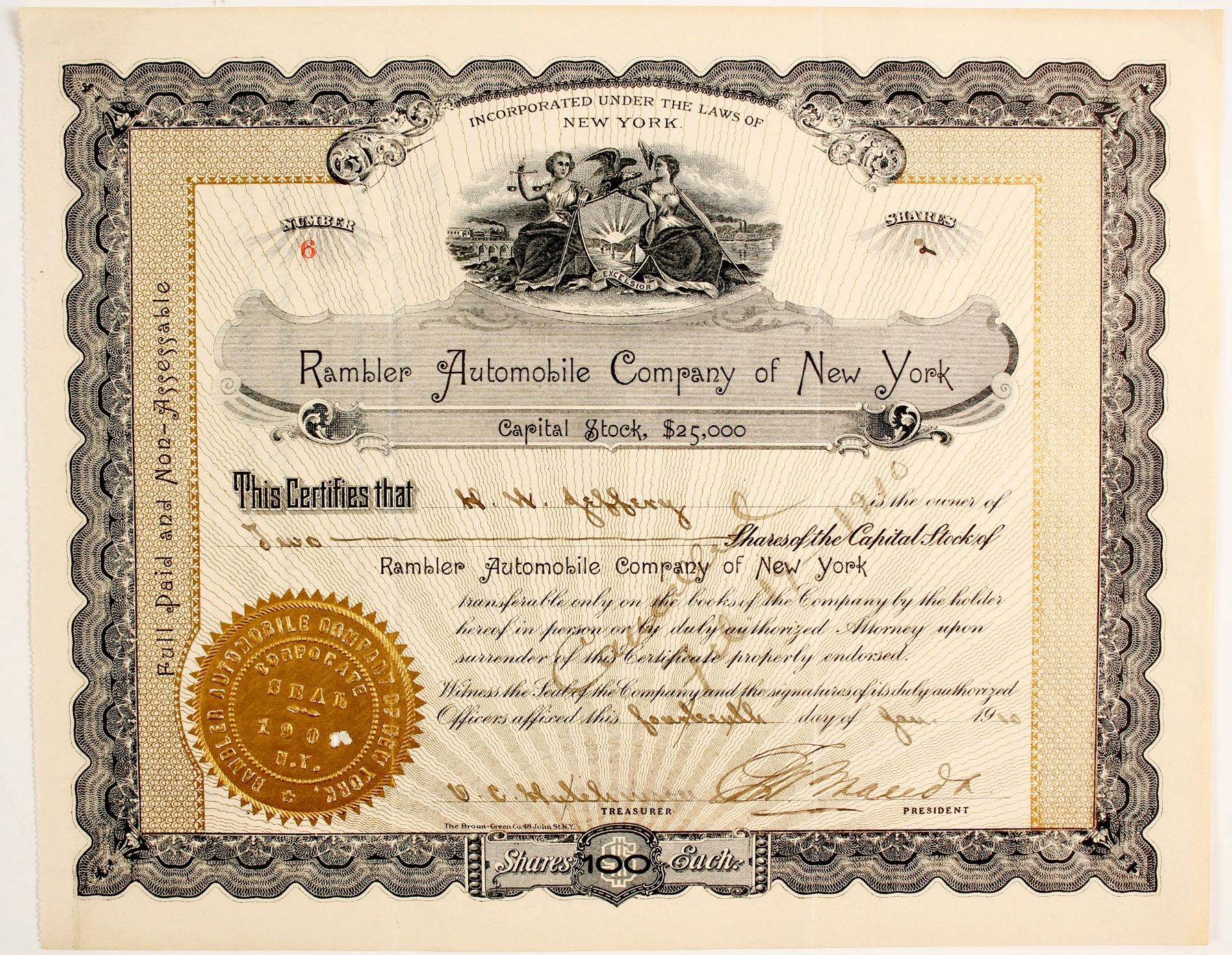 2 shares of Rambler Automobile Company of NY, cert. #6, issued to H. W. Jeffery on Jan 14, 1910. Signed by W.C. Hulehiuson, treas and Maeed, pres. Gold seal and grey border. Inc. under the laws of NY. Vignette of two women 1 with scale and one with staff around a shield with sun and boats under and eagle above. 1st use of Rambler name for American-made automobile dates to 1897 when Thomas B. Jeffery of Chicago, IL and builder of the Rambler bicycle, constructed his 1st prototype automobile. Received positive reviews at the 1899 Chicago International Exhibition & Tournament and 1st National Automobile Show in NYC, Jeffery enter automobile business. In 1900, he bought the old Sterling Bicycle Co. factory in Kenosha, WI and started production. He started production s in 1902 and by year's end produced 1,500 motorcars, 1/6 of all existing in US at the time. Thomas B. Jeffery Co was 2nd largest auto manufacturer at that time. Rambler was 1st to equip cars with a spare wheel-and-tire assembly. When driver got a flat he could exchange the spare wheel & tire for the flat one. Printed: The Bround-Green Co., 48 John St. NY. Prag collection.