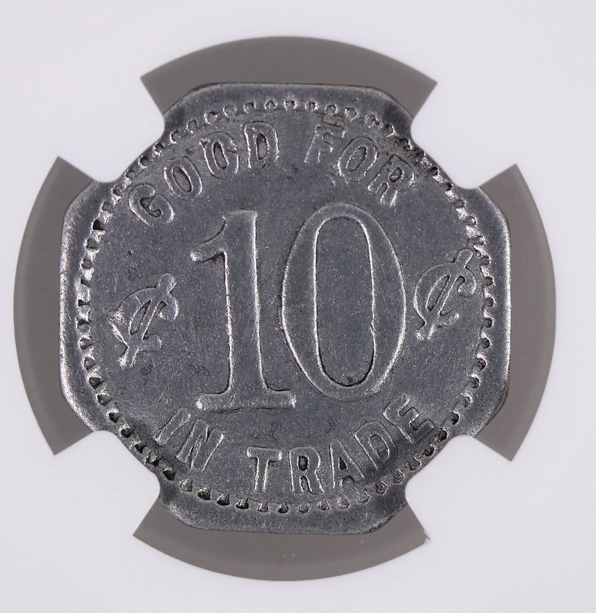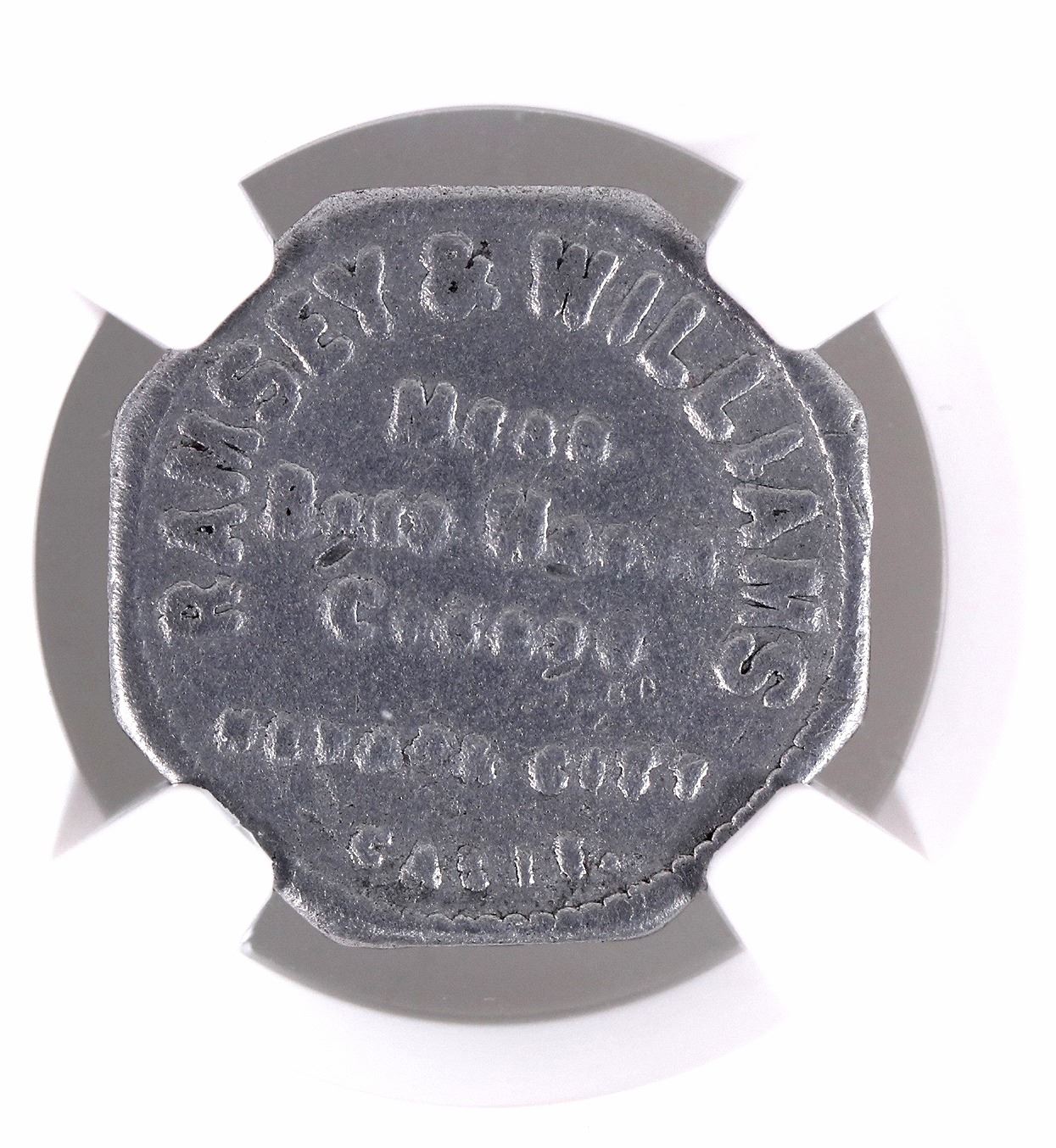 Very rare Nevada City token! NGC certified VF Details, whizzed. RAMSEY & WILLIAMS / MFRS. / BRET HARTE / CIGARS / NEVADA CITY / CALIF. //GOOD FOR / c10c / IN TRADE; Al., octagonal, 25 mm.