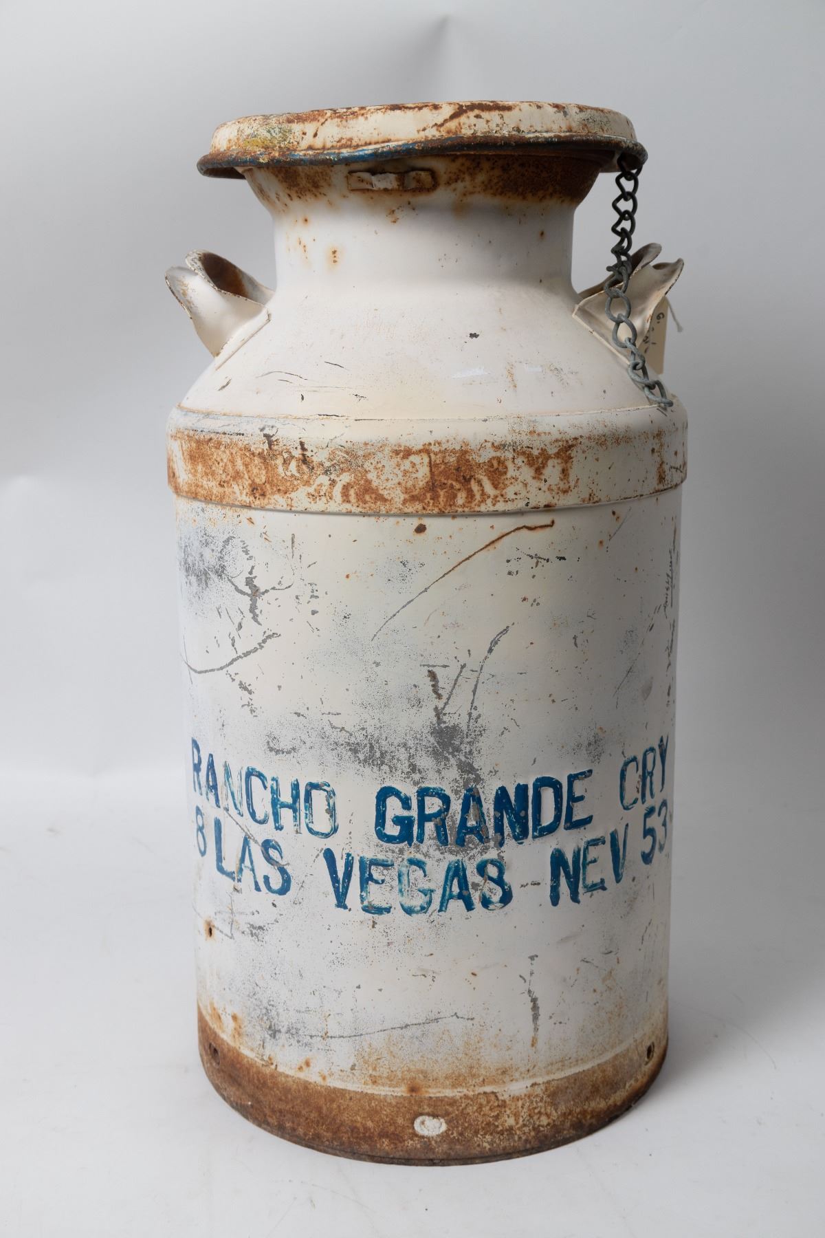 Large embossed milk jug from the Rancho Grande Creamery in Las Vegas. Text on the front reads, "Rancho Grande, Cry/ 8 Las Vegas- Nev. 53." Painted white with blue lettering. In March 1931, this creamery was purchased by Edwin Carewe, an American motion picture director. This jug is about 24 inches tall and 41 inches in diameter.