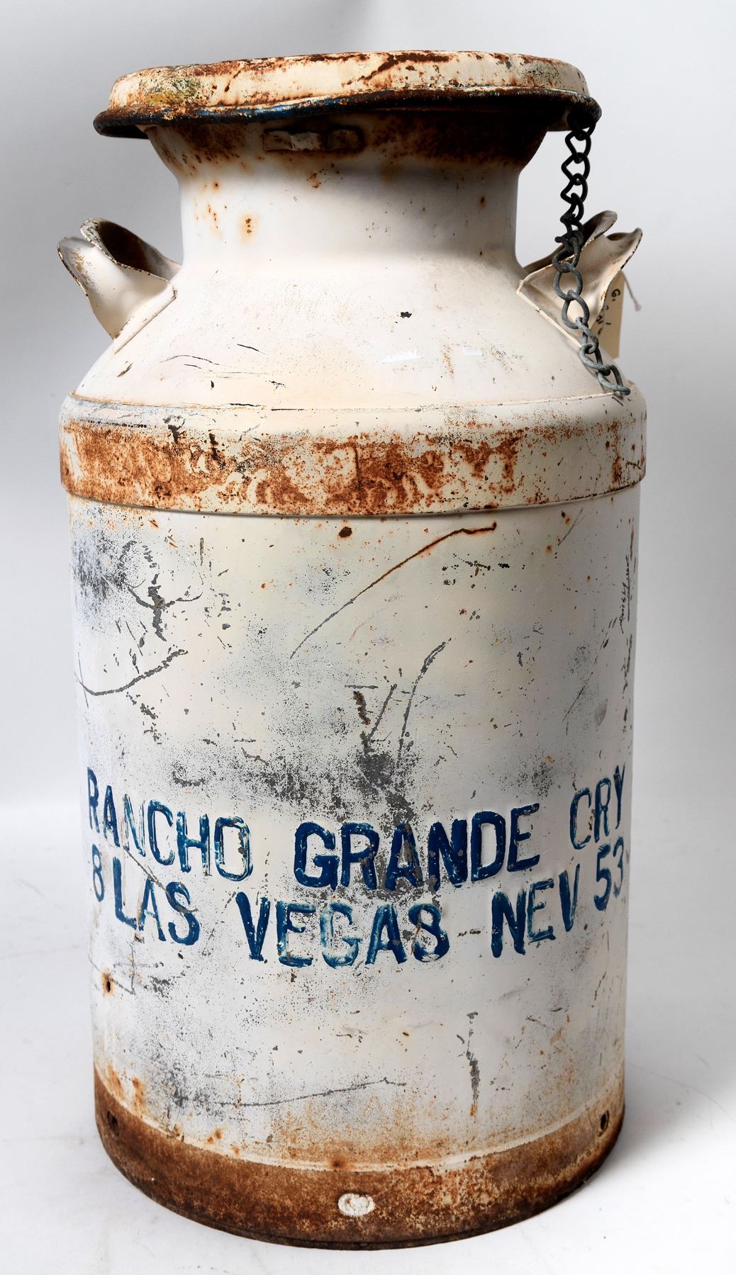 Large embossed milk jug from the Rancho Grande Creamery in Las Vegas. Text on the front reads, "Rancho Grande, Cry/ 8 Las Vegas- Nev. 53." Painted white with blue lettering. In March 1931, this creamery was purchased by Edwin Carewe, an American motion picture director. This jug is about 24 inches tall and 41 inches in diameter. Las Vegas Nevada