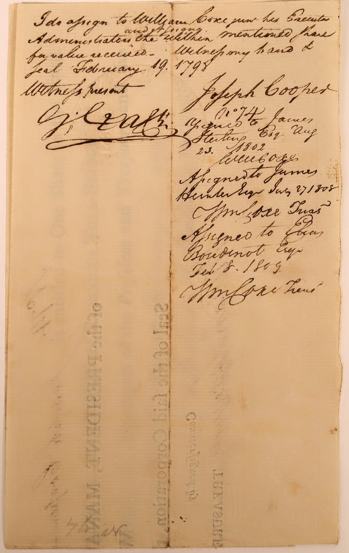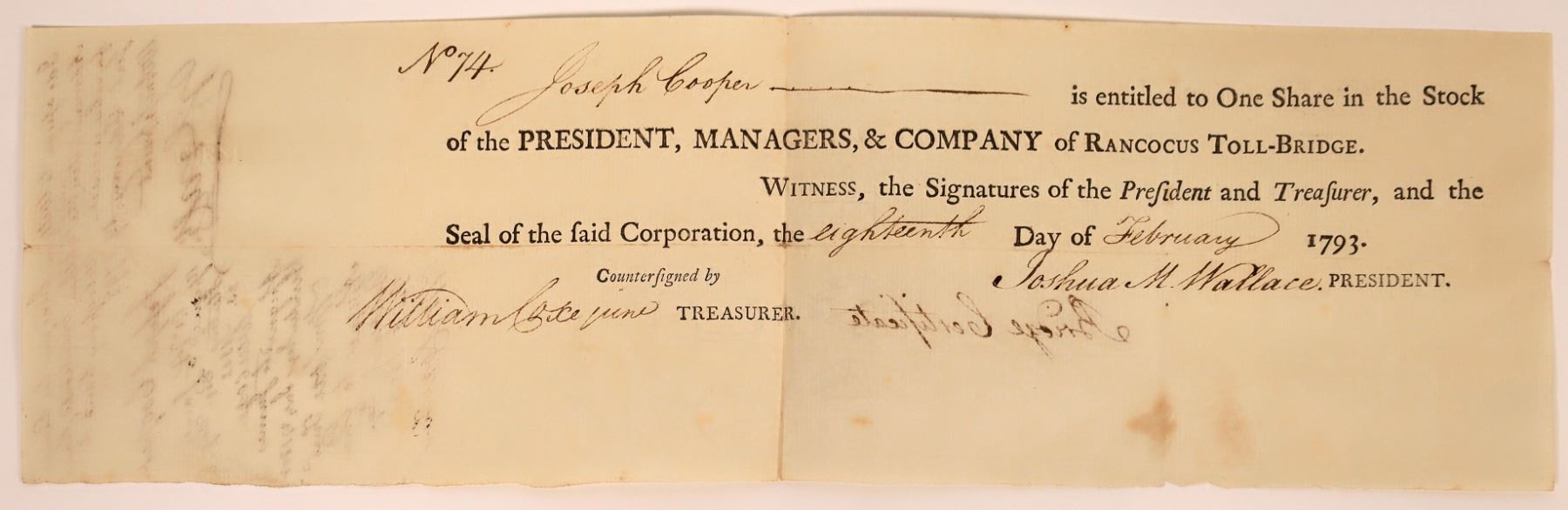 Rancocus Toll-Bridge issued February 18, 1793, to Joseph Cooper. Number 74. signed by Joshua M Wallace as president. 15 x 4.5". Nicks along edges. Endorsed by Cooper on back. Wallace was a member of the New Jersey convention that ratified the U.S. Constitution in 1787. A private company erected the first bridge at Delran, New Jersey in 1793 to replace the ferry that had operated at this location since 1748, the year that the Colonial Assembly first authorized a road between Burlington and the ferries operating to Philadelphia. Heavy horizontal fold and some small nicks at border. otherwise very nice!
