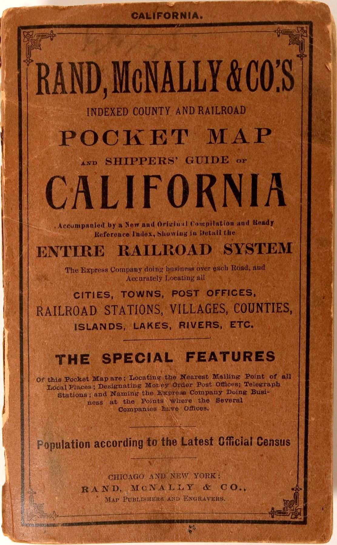 "Rand, McNally & Co's indexed county and railroad Pocket Map and Shippers' Guide of California," copyrighted 1906. Map shows entire railroad system, cities, towns, post offices, railroad stations, villages, counties, islands, lakes, rivers, etc. Population according to latest census. Advertisement for Columbian Correspondence College, Washington, D.C., inside front cover, and for Rand, McNally maps of other states on the back cover. More advertisements on inside pages.