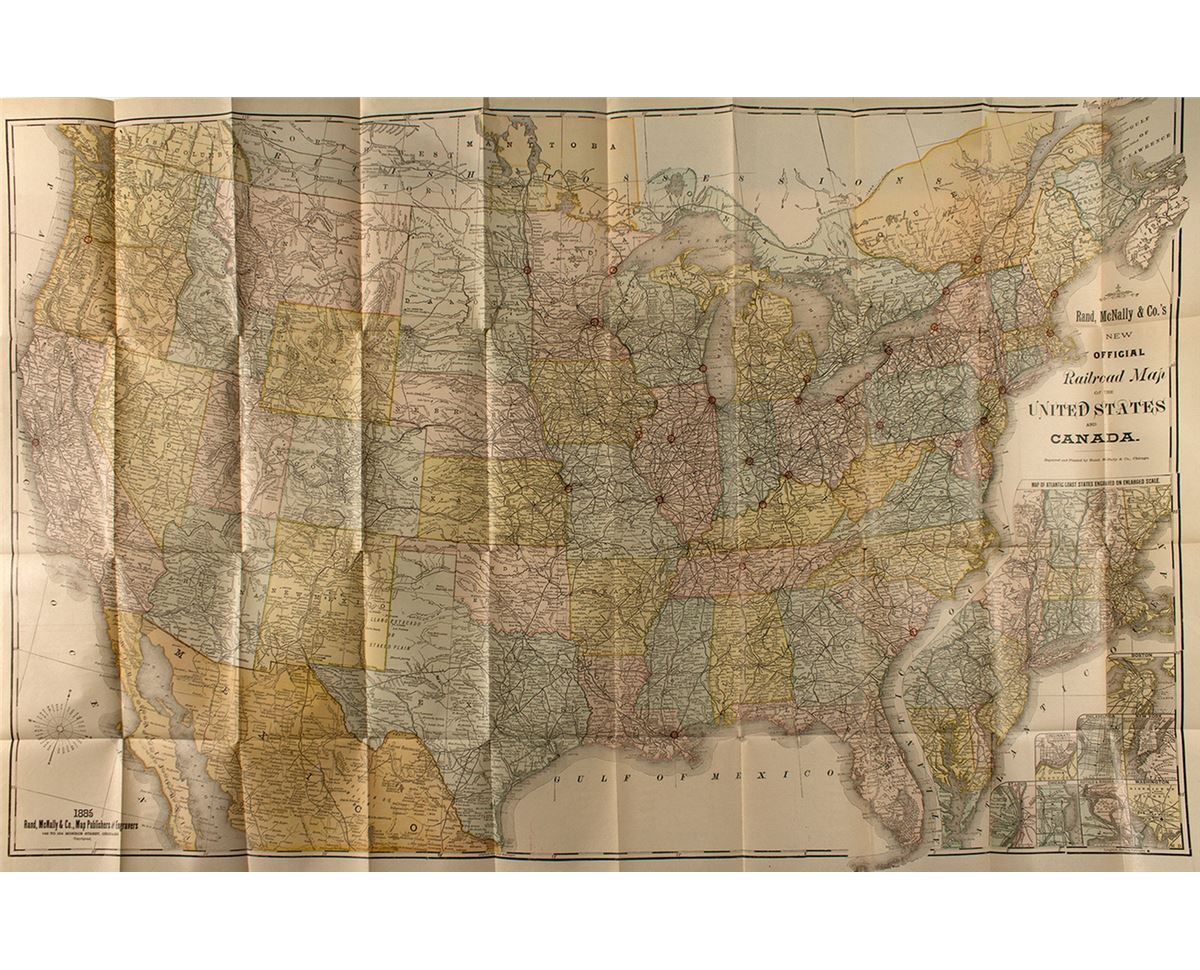 Beautiful map shows railroads throughout the U. S. and Canada. Engraved and printed by rand McNally & co., Chicago. Good condition, a couple of small tears on folds. (28" x 43.5")