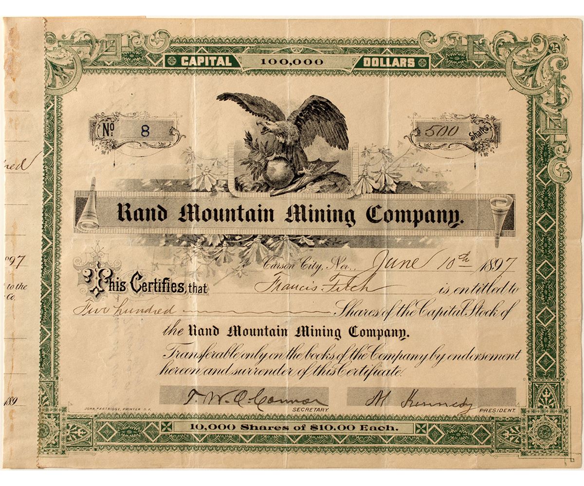 Very early and rare! #8 for 500 shares to Francis Fitch signed by Connor and Kennedy. In 1897 the Los Angeles Times reported that the stock for this company was selling low, but mining men in the know were holding on to their shares!