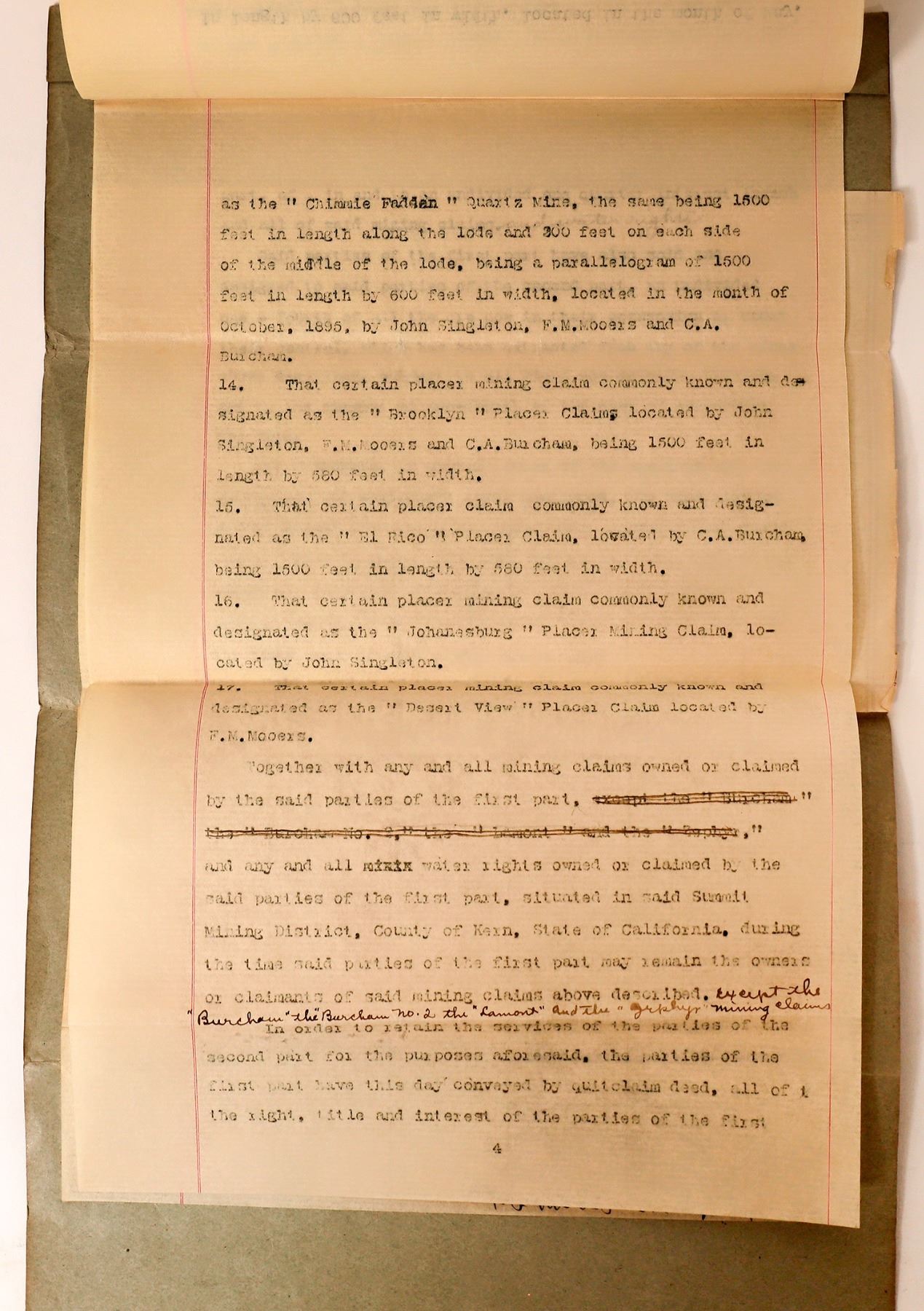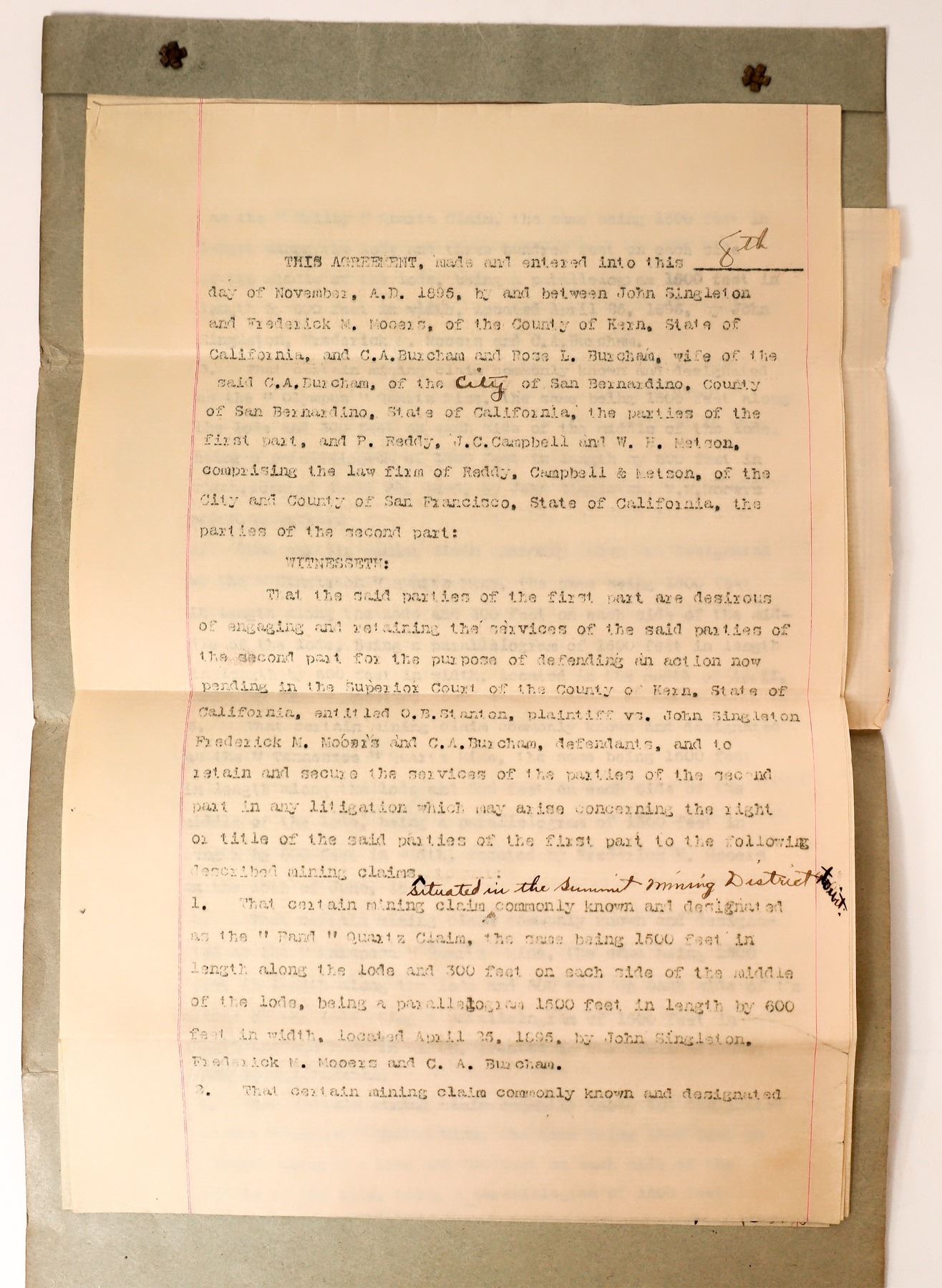 This is a settlement agreement, dated Aug. 13, 1897. Charles Austin Burcham, John Singleton and Frederic M. Mooers staked their claim on the Rand Mine, later renamed the Yellow Aster Mine, on April 25, 1895 in eastern Kern County, California. Approximately 150 men were employed at the Yellow Aster by the end of 1899, and both a thirty stamp mill and a one hundred stamp mill were constructed by 1901. After the deaths of Mooers (1900), Burcham (1913) and Singleton (1914), lawsuits over the ownership of the mine eventually gave way to the control of Albert Ancker and Arthur Asher, whose families had long been associated with the Tehachapi and Mojave areas. However, Dr. Rose La Monte Burcham, wife of Charles Austin Burcham, continued to hold a position on the Yellow Aster's Board of Directors and retained many of the company's shares. Very nice condition. California 1897