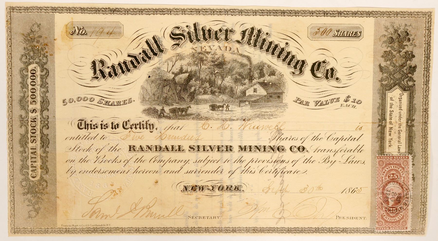 # 194 for 500 shares to CH Wisswell. Signed by Samuel J Burrell and president William C Joy. Dateline New York 1865. 25c Certificate revenue stamp. Not cancelled. Francis Hart & Co. printer. Quaint mining and milling scene. Staining (mostly from residue of glue on the back?). No edge or corner issues. We can not be sure when the official date of incorporation is, but in the 1865 annual report printed in the New York Times, it mentions that "filed in the office of the Clerk of the City and County of New York, November 2, 1864." This makes this company incorporating 2 days after statehood at the latest. Original incorporators were Joy, Burrell, JT Raplee and CW Merritt. Although the location is not mention, most New York companies invested in the Reese River, Humboldt County or Churchill County in that order. Ken Prag Collection