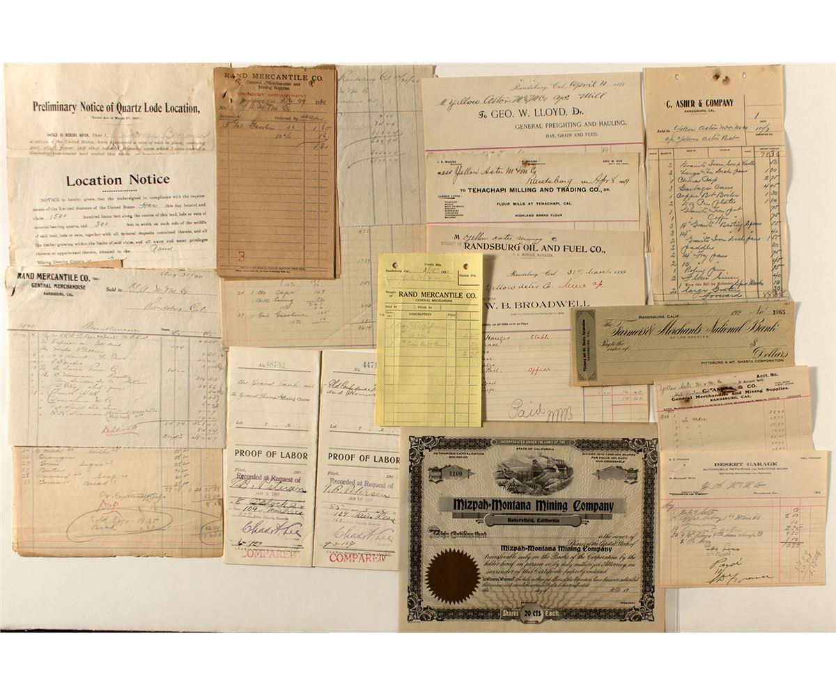 Desert Garage 192-. Two C Asher & Company, General merchandise, 1907. W. B. Broadwell, 1899. Randsburg Oil & Fuel 1899. Tehachapi Milling and Trading Co., Two 1899. Geo. W. Lloyd freighting, 1899. Ten pieces from the Rand Mercantile Company. 192- Pittsburg & Mt. Shasta Corporation check. 1907 location notice for 1,500 linear feet. 1914 and 1916 proof of labor on the Grand Thank. One preliminary notice of quartz location, 1901. Rips on folds. One unused Mizpah-Montana Mining Company stock 19--.