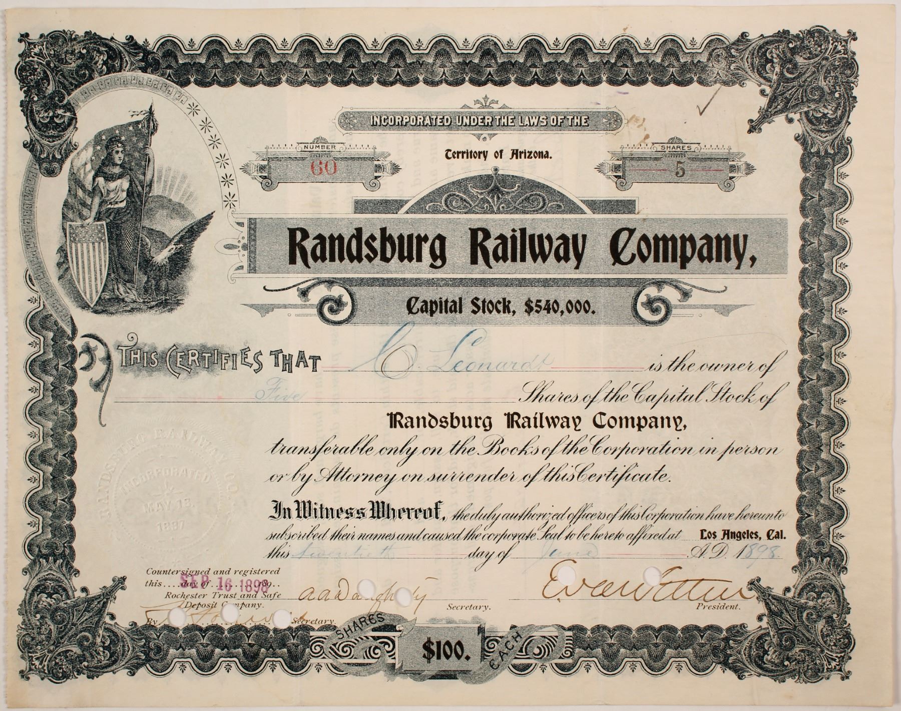 incorporated Territory of Arizona May 18, 1887. The Randsburg Railway was a 28.5-mile branch line railroad in California's Mojave Desert. It originated at the main line of the Atchison, Topeka, and Santa Fe Railroad (AT&SF) at Kramer Junction, California, and terminated at Johannesburg, California. Cert #60 for 5 shares of common stock @ $100 per share issued to C. Leonard 20 June, 1898 signed President (illegible),corp seal left lower, black, Vignette top left lady Liberty with shield and American flag, eagle with wings spread, two revenue stamps on reverse, cancel punch holes on bottom, printer unidentified, very fine condition. Not in Cox ref City: State: Date: HWAC# 82717