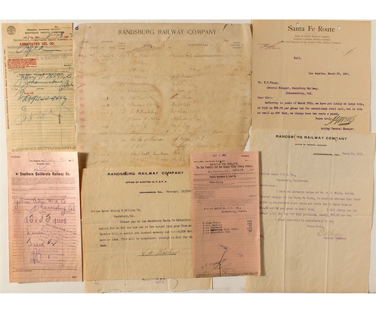 Lot of eight. Three 1898-1902 letterheads. One voucher for the audit of February, 1902. (Poor condition). One Santa Fe Route letterhead to Randsburg Railway in Johannesburg. Three railroad receipts for the Yellow Aster Mine.