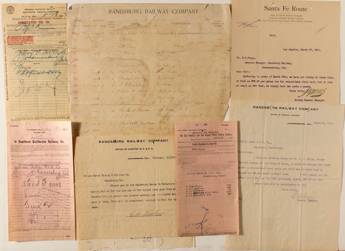 Lot of eight. Three 1898-1902 letterheads. One voucher for the audit of February, 1902. (Poor condition). One Santa Fe Route letterhead to Randsburg Railway in Johannesburg. Three railroad receipts for the Yellow Aster Mine. City: Randsburg State: California Date: 1898-1902 hwac# 20464