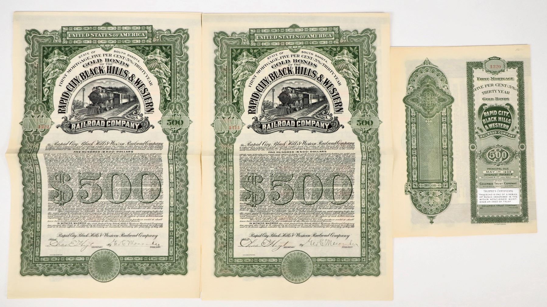 Lot of 3. I/U. Issued 1919. EF cond. Rapid City, Black Hills & Western Railroad Co., $500, 5% gold bearer bond. with coupons. Globe Litho Co. printer. At the time it was the only RR operating through the Black Hills from east to west.