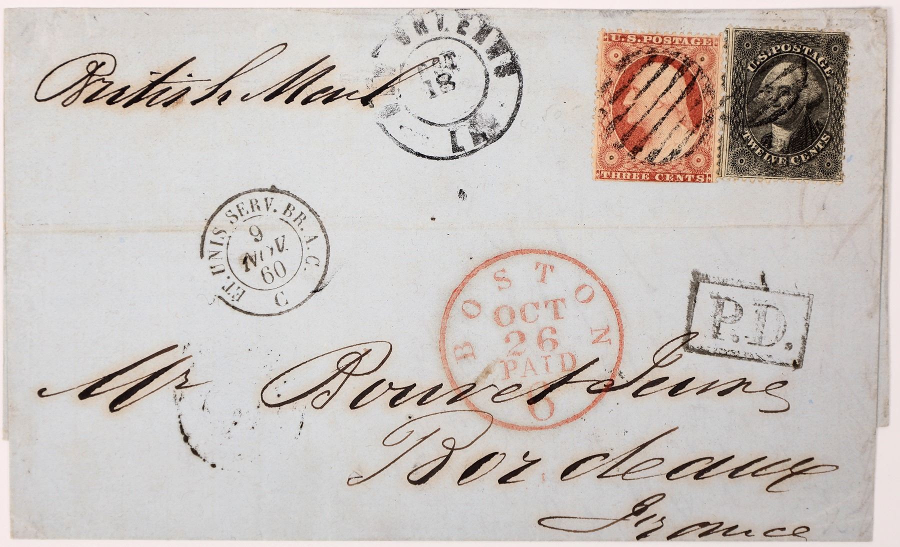 Rare cover to France with 3 cent and 12 cent with black grid cancel. 12 cent perf cuts into right side. Red Boston paid 6 cent. 2 Bordeaux cancels on back. October 18, 1860, New Orleans, LA. British mail marking at top.