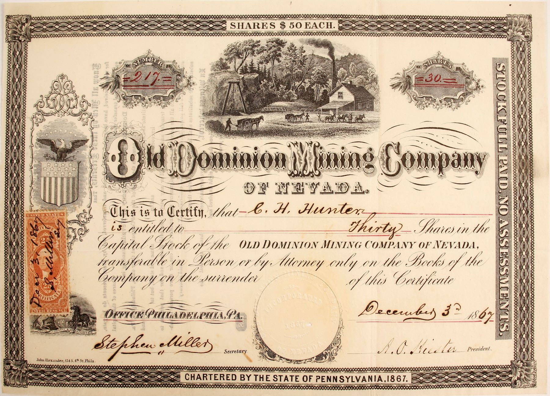Rare location. Inc. in Pennsylvania in 1867. No. 217, issued for 30 shares to CH Hunter on December 3rd, 1867. Signed by the president, A.O. Hiester, and secretary, Stephen Miller. Not cancelled.Nice vignette at the top of a busy surface scene at a mine including a windlass and mill. Also Pennsylvania seal at the bottom left and eagle on patriotic shield at upper right. Printed by John Alexander, Philadelphia.Folds, some toning. The Old Dominion was located in the Hot Creek District and the most active of the early producing mines there. In 1869, they received more than $11,000 from just 111 tons of ore! Hot Creek was organized in 1866. Unlike many Nevada mining camps, it actually had abundant wood, water and grass. The name came from a few hot springs that warmed the creeks. The mine appears to have gone dormant after 1870 when the near surface ores were exhausted. [Ref: Stretch, Raymond] Additional information on the mine and mining district is included. Also Nevada historical backgrounds on the names on the certificate are included. City: Hot Creek, Nye County State: Nevada Date:
