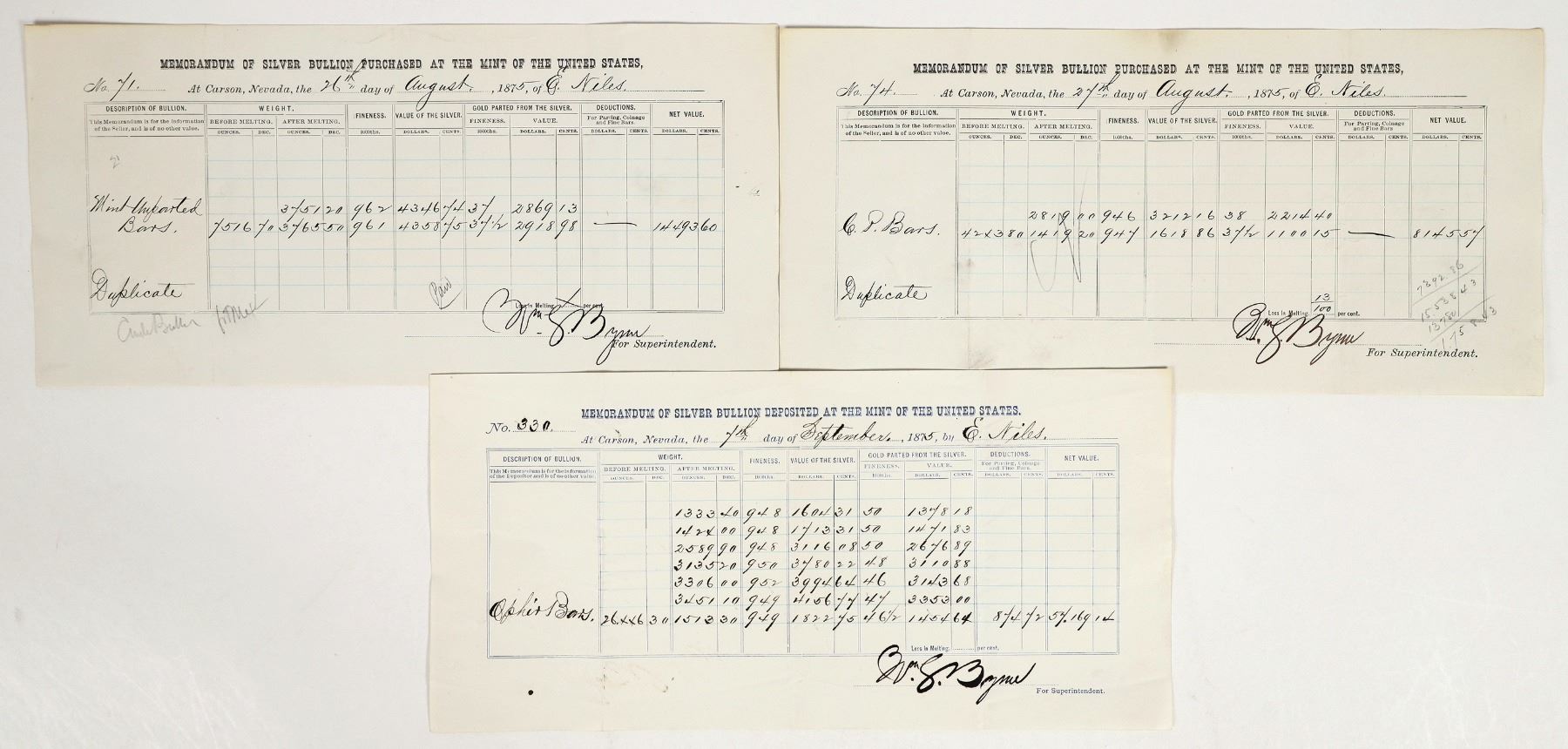 Lot of 3 different. All deposited by E. Niles, who was chief clerk for Henry Yerington of the V&T railroad. These are massive deposits (4,000+ ounces), likely a political decision so that the bullion would not be routed to the San Francisco Mint. At the time, Mint Director Linderman was making statements that some have interpreted he was bias against the CC Mint. (See the 1875 Mint Report where he says SF is the "natural market" for the Comstock bullion to be sent). He was more in favor of centralized Mints like at SF and New Orleans. 1) No. 74, August 27th, 1875. Deposit of C.P. Bars (for Crown Point in Gold Hill), 4,243 ounces split into two bars. Both are typical for Comstock ores, .946 and .947 silver fineness. Folds, soiling. The Crown Point was the site of a major bonanza discovery in 1871 with its neighbor the Belcher. William Sharon and the Bank of Cal. controlled the mine at the time, but Alvinza Hayward and John P. Jones bought a majority of the stock before the true extent of the bonanza was known. 5.5 x 11.5" Black form. 2) No. 71, August 27th, 187. Deposit of "Mint Unparted Bars," an unusual classification as all of the Comstock bullion coming in would be unparted. Lower down is a pencil notation saying "Crude Bullion for Mex" (likely referring to the Mexican Mine). 7,516 ounce deposit made into two bars, .961 and .962 fineness silver. Folds. Black form. 3) Blue form (more typical for silver). No. 330, Sept. 7th, 1875. Deposit of Ophir Bars, 26,446 ounces made into 7 bars (ounces don't add up, possibly made into more bars not noted here). .948-.952 fineness silver. Folds. 5.5 x 11.25"