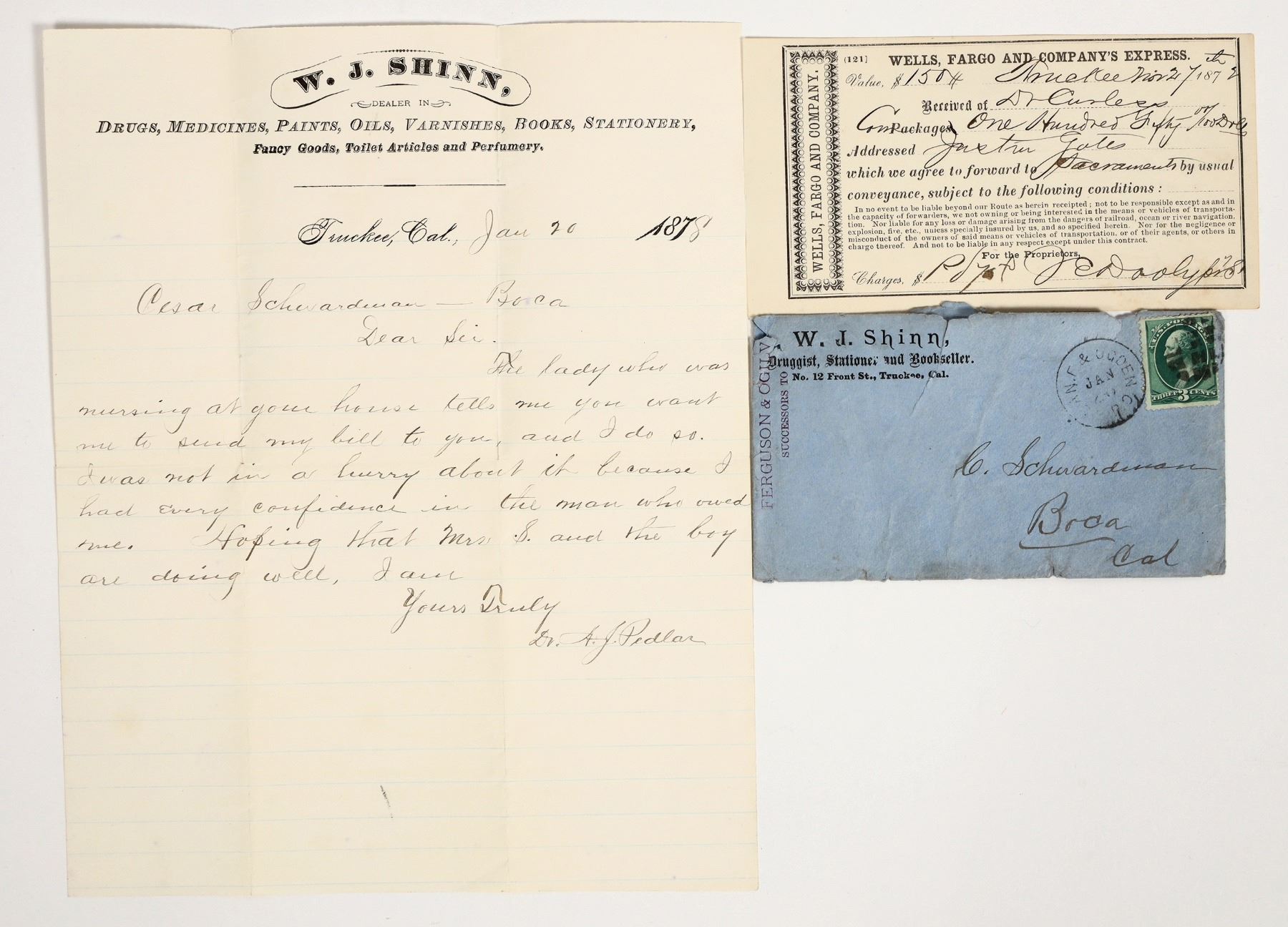 Lot of 3. 1-2) Corner ad cover and letterhead for W.J. Shinn, Dealer in Drugs, Medicines, Paints, Oils, Varnishes, Books, Stationery. Truckee, California, 1878. Message to Cesar Schwardman at nearby ice/lumber camp Boca. Cover is blue with 3 cent postage stamp. Very rare. 2) Truckee Wells Fargo Receipt from Curless. Very rare. Dateline Truckee, Nov. 27th, 1872. Received of Dr. Curless a package of $150 sent to Justin Gates of Sacramento. Signed by Dooly. 3.25 x 6" The Curless brothers came to Truckee in the 1860s and opened the first drug store there in 1869. George Washington Curless ran the store. His brother William was a physician and Truckee's primary doctor. Dr. Curless was on-board the ill-fated SS Central America that sank in 1857, but disembarked in New Orleans, a few days before the sinking. For more on Truckee druggists, please see Volume Two of the Nevada Bottle Book.