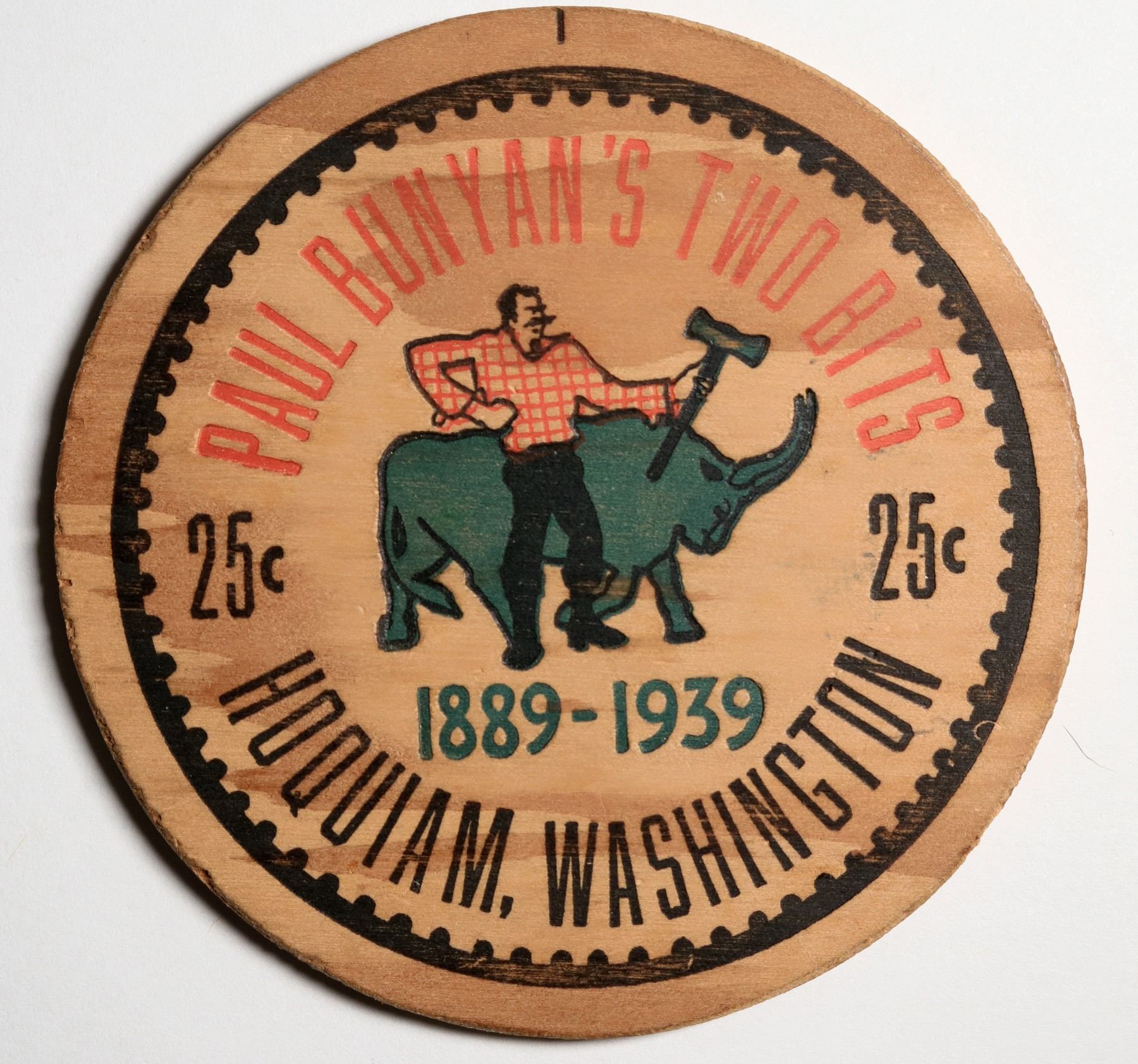 Three-inch diameter wood token is printed with a picture of Paul Bunyan and his ox in red and green ink. The obverse reads, "Paul Bunyan's Two Bits, 1889-1939, Hoquiam, Washington," with 25 cent symbol on each side. Reverse reads, "Good for 25 cents in Trade in any Hoquiam, Wash., store. Redeemable by Hoquiam Jubilee Association, Inc. Before Aug. 15, 1939." See photo for details.