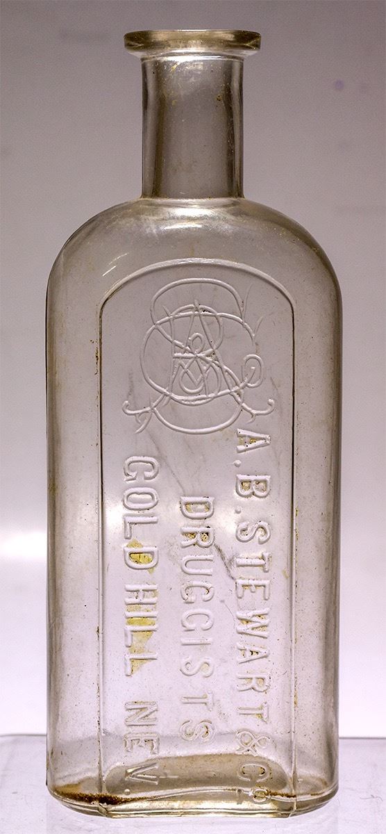 6.75" clear Penn oval. A. B. STEWART & CO, / DRUGGISTS / GOLD HILL NEV / WT& CO Extra rare bottle. No visible chips or cracks. Page 328 in Holabird, book example. Date: c. 1877-1880 Location: Gold Hill, Nevada HWAC# 57926