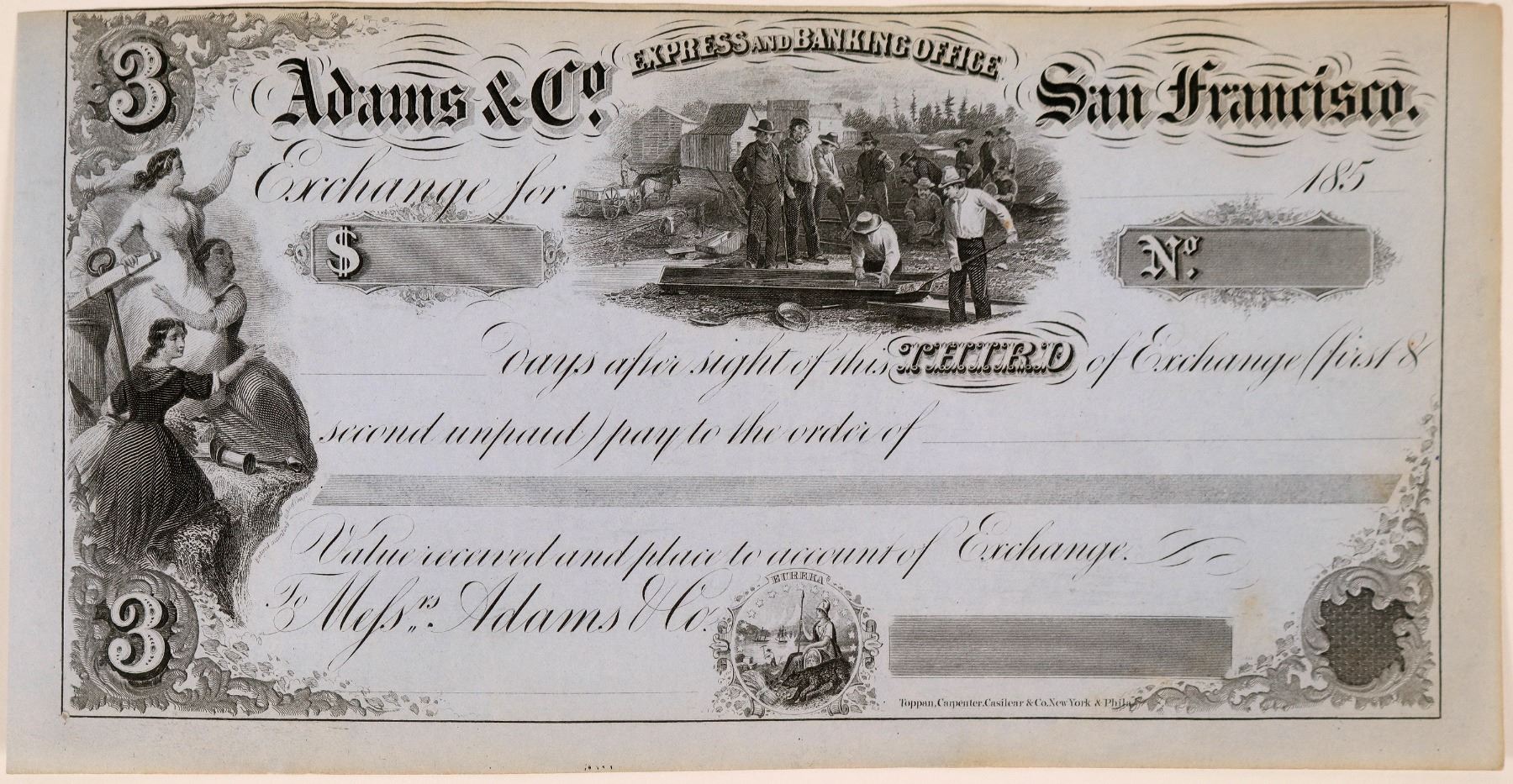 Gold Rush era Third of Exchange from Adams & Company. Unused. Dated 185-. Some wrinkles and light discoloration on top. Nice condition! Vignette of placer mining.