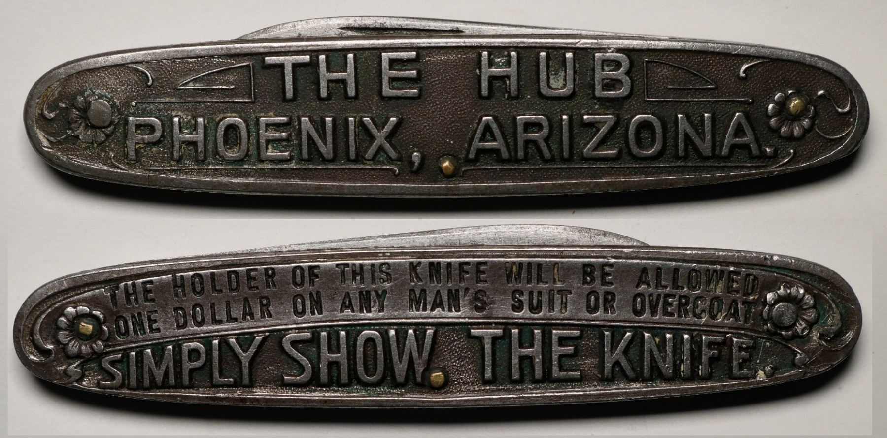 The Hub / Phoenix, Arizona. // THE HOLDER OF THIS KNIFE WILL BE ALLOWED / ONE DOLLAR ON ANY MAN'S SUIT OR OVERCOAT / SIMPLY SHOW THE KNIFE. 75mm. Unusual and rare!