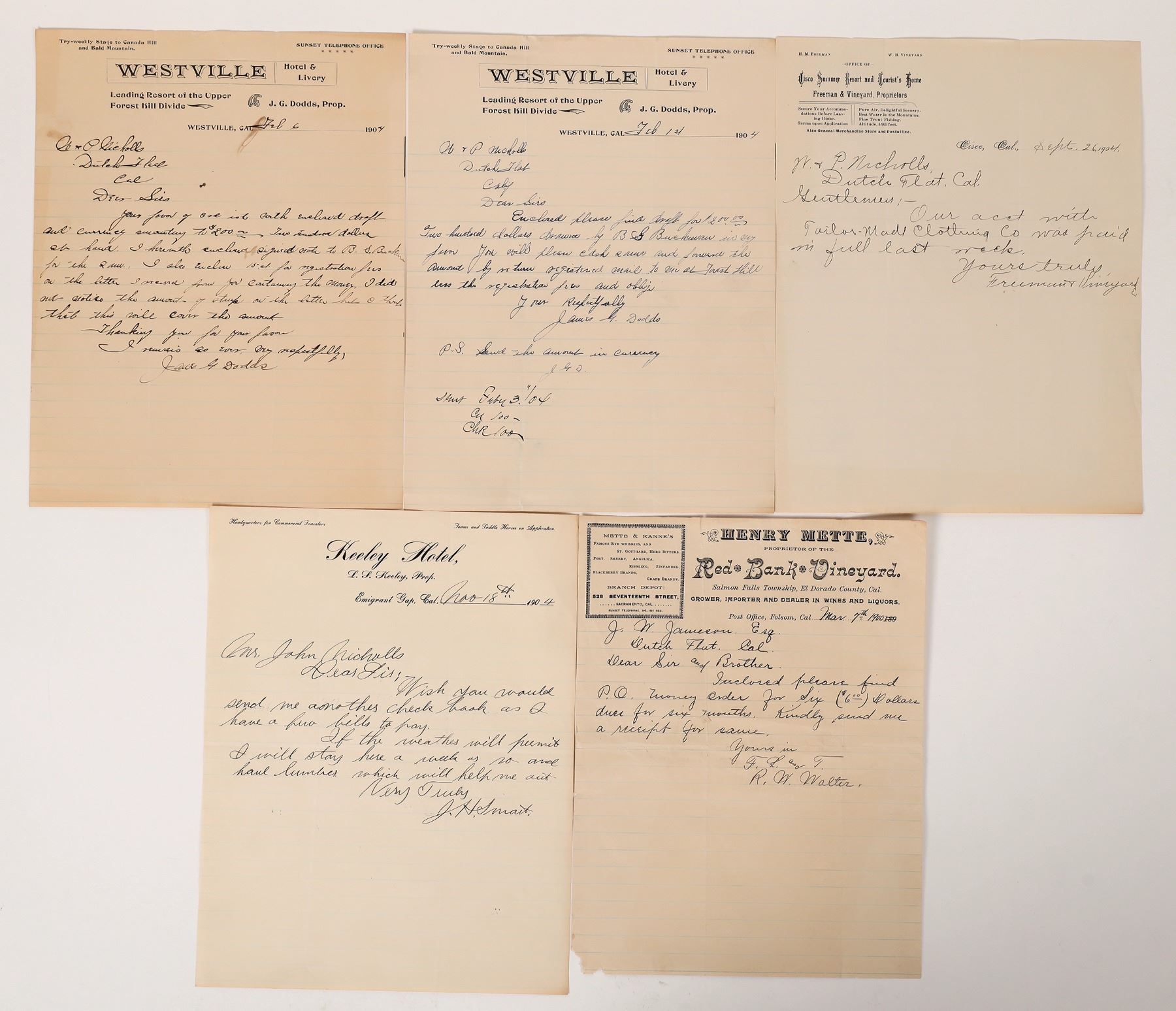 Billheads (5) from that include Keeley Hotel of Emigrant Gap (Placer County), Westville Hotel & Livery (Placer County) (2), Cisco Summer Resort (Placer County) and Henry Mette Red Bank Vineyard, Salmon Falls (El Dorado County). All are RARE and in nice condition. Please see photos for more details. California Westville 1900s