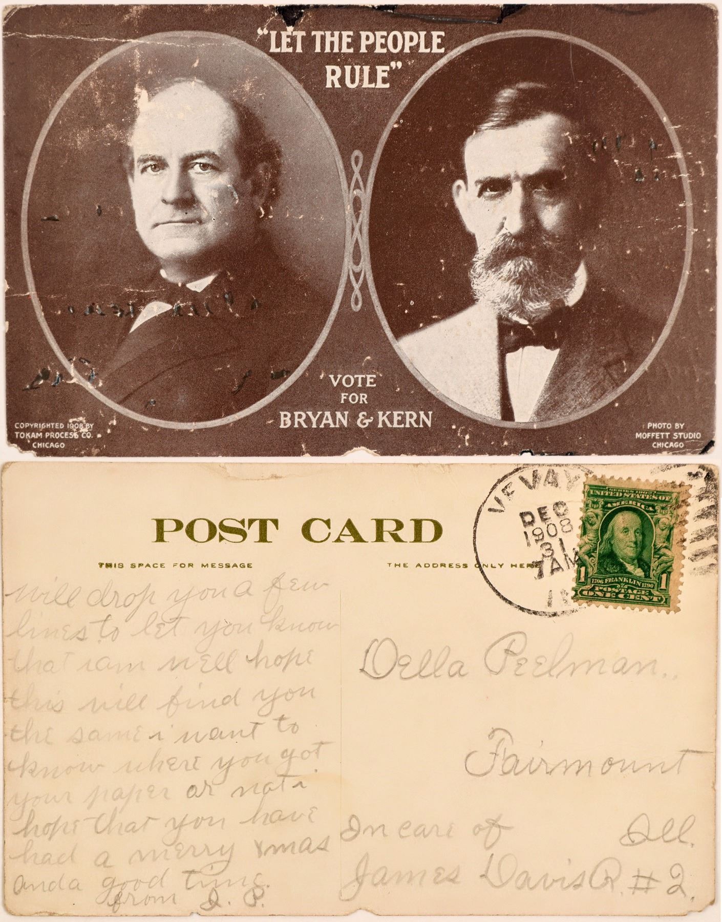 Scarce postcard advertising the Bryan/Kern presidential ticket for the 1908 election. William Jennings Bryan lost the election to Taft. Card shows oval portraits of Bryan and Kern, along with the slogan "Let The People Rule." Copyright 1908 by Tokam Process Co., Chicago. Mailed to Fairmount, Illinois. Vevay cancel. Chips on borders, scuffs. Bryan was famous for his "Cross of Gold Speech" that attacked the gold standard.