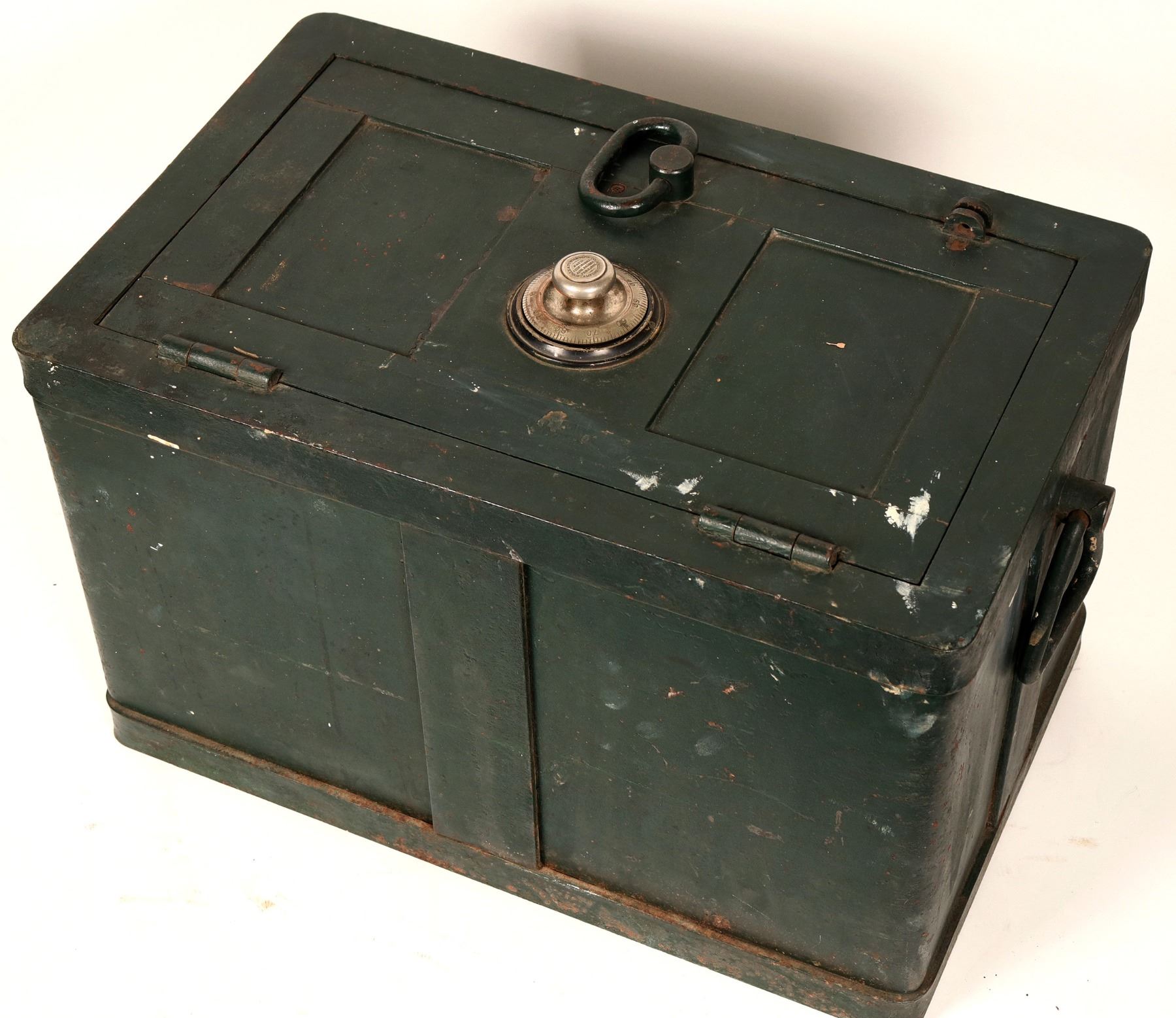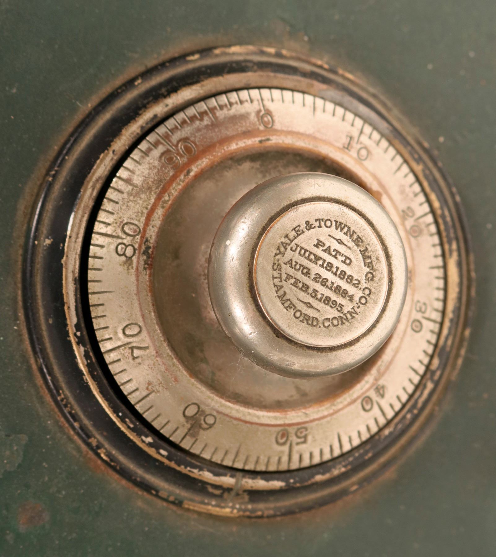 Antique strong box/safe measures 24"x 15"x 15" with working combination lock. Combination lock code included. Heavy, iron/steel construction finished in dark green on outside and black inside. The two squares panels on the lid were originally detailed with a gold rectangular outline that is still partially visible. It appears there was some lettering on the front panel that is no longer visible. Manufacturer name is printed inside safe door: Victor Safe and Lock Co. Cincinnati, Ohio 1918, a well-known award winning safe manufacturer that operated in the late1880s to early to mid 1900s. A number is imprinted on the lid handle, possibly the serial number for the Victor Safe model. The combination lock is stamped Yale & Towne Stanford, CT with patent information on the dial. The locking mechanism still operates flawlessly and dial spins smoothly. Yale & Town Mfg Co. was founded in 1868 by Linus Yale, Jr, inventor of the pin tumbler lock, and Henry R. Towne. The company has a long history and was one of the leading employers in the Stanford area for many years. This same model of Victor strong box has been referenced as both a Railroad strong box and Stagecoach strongbox and could quite possibly have been a Wells Fargo safe at one time. This strong box is dated 1918, the same year the federal government forced Wells Fargo and other private express companies to form the federally governed American Railway Express Company. Additionally, the box is identical to a known U.S. Army WWI Quartermaster Corps Strong Box we found in our research. This particular safe was reportedly purchased at a major estate sale in Colton, California over 40 years ago. Colton is considered the home town of the Earp Family of Wild West fame. This safe is in very good condition and waiting for your valuables. See photos for more details.