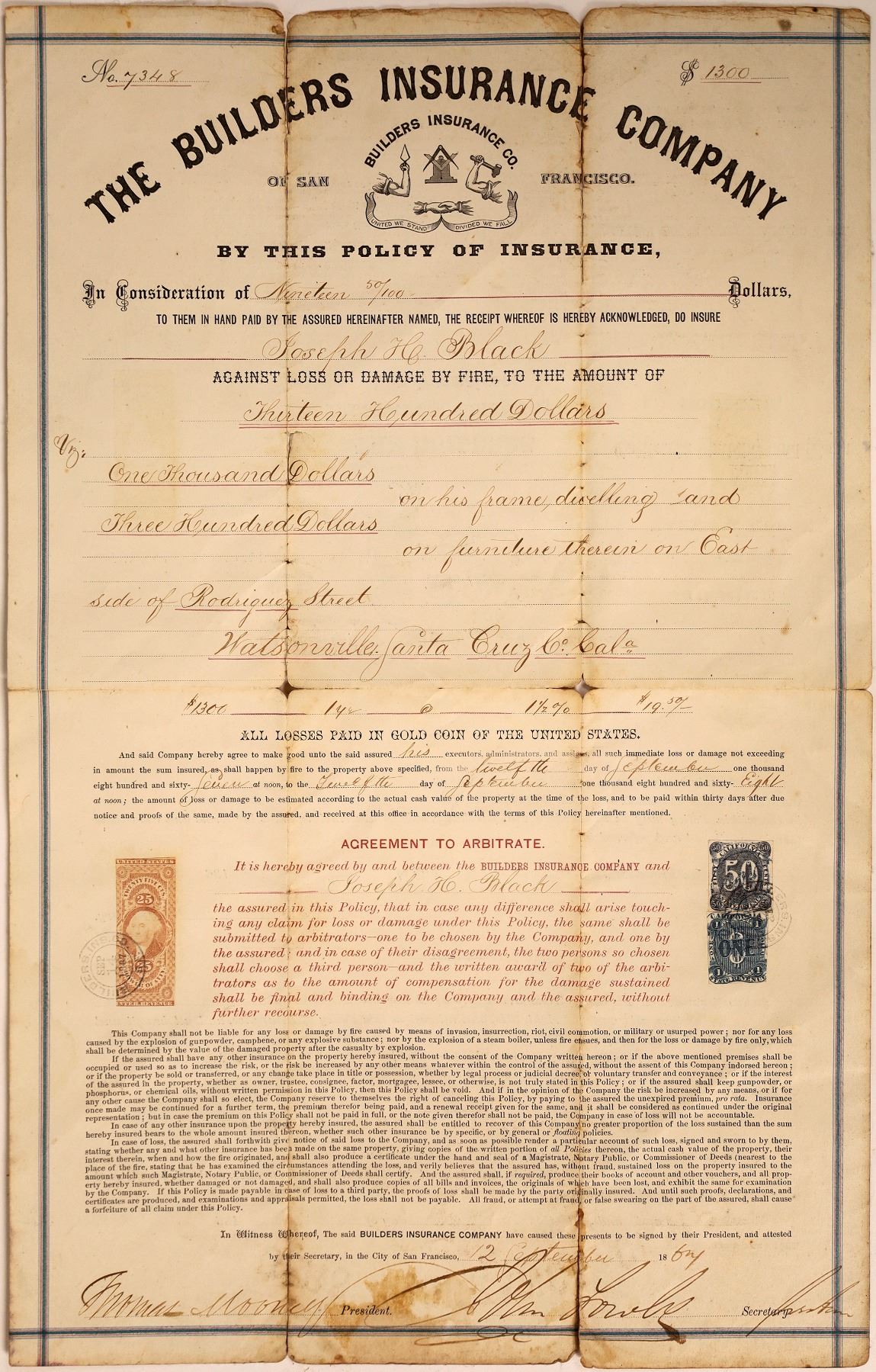 Most interesting is the $1.00 and 50c California tax stamps. Tied with Builder Insurance cancel. Builders Insurance Company policy. 1868 for Joseph H. Black for $1,300 in fire insurance. House located at Watsonville, Santa Cruz, California. 25 Power of Attorney United States Revenue Stamp. Poor condition, but easily readable!