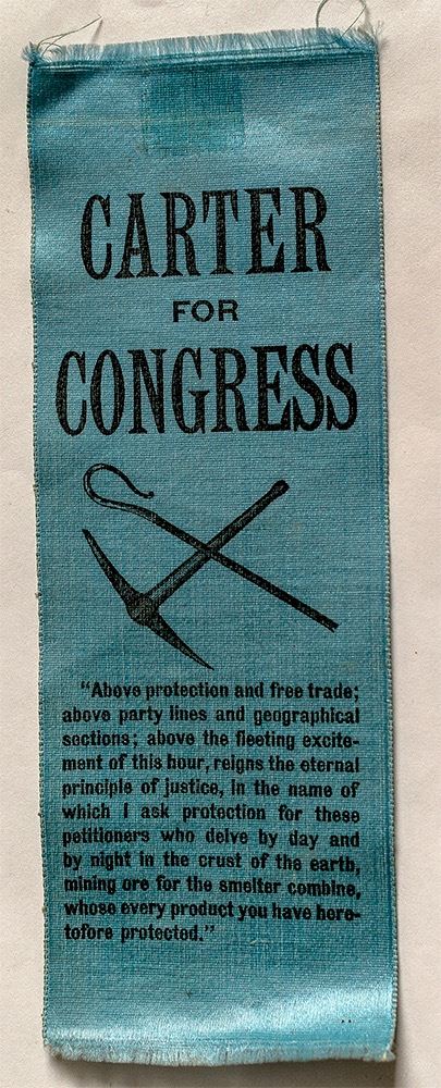 Unusual political ribbon that advocates Carter for Congress. Has a pictorial mine pick and sheep herding stick. Has a campaign description on the bottom. Rare. City: State: Date: Inventory# 40811