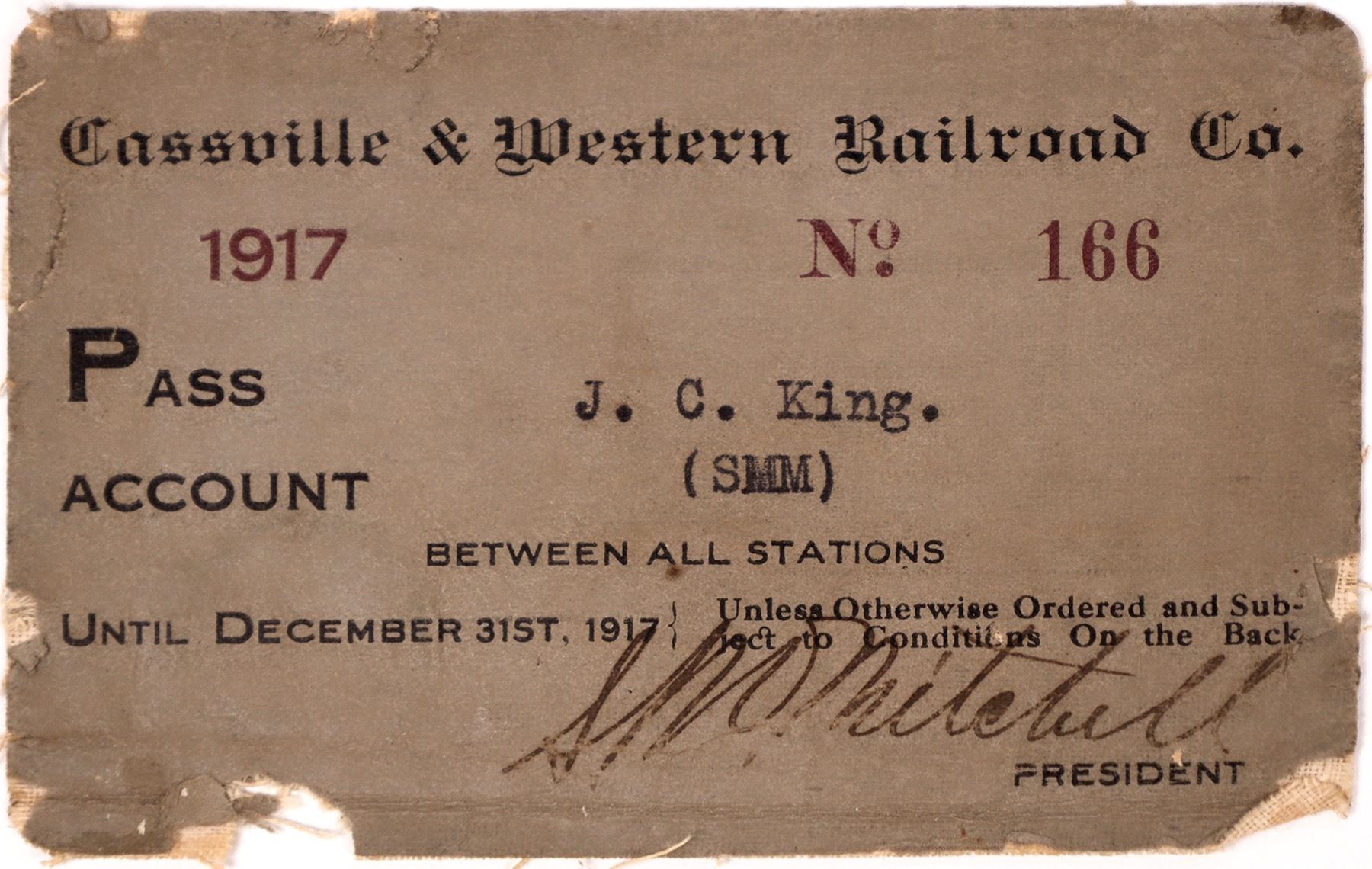 A very rare railroad pass. Please note it is damaged. Cassville & Western Railroad Co. This railroad connected Cassville, MO with Exeter, MO along a five mile right of way. Construction of this line was completed June 1896, and was imperative to Cassville's success, as roads to the town were impassable during the winter. By 1919, the line faced bankruptcy, although after reorganization as the Cassville & Exeter Railroad, it's fortunes changed dramatically. Billed as the shortest independent standard-gauge railroad & newspapers across the U.S. and Ripley's Believe It or Not publicized the line, and it's one-man operator. Signed by company president (again please see photos of front and back for damaged condition). Still a rare and very cool piece.