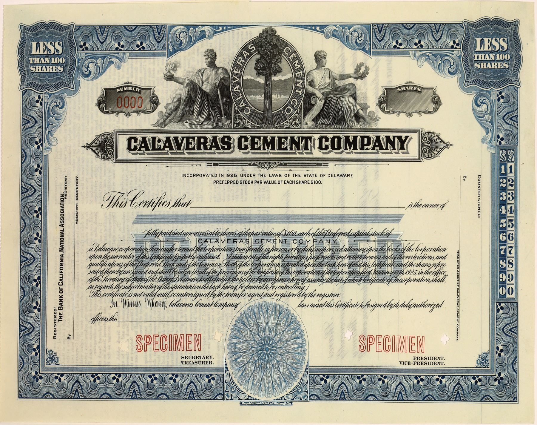 This is a stock certificate specimen from the Calaveras Cement Company. Located in San Andreas, the company supplied building material for the San Francisco Airport, The SF Bay Bridge, The California Aqueduct, The Oroville Dam and both Travis and McClellan Air Force Bases. Cert is untouched. Please see photos for more detail and condition.