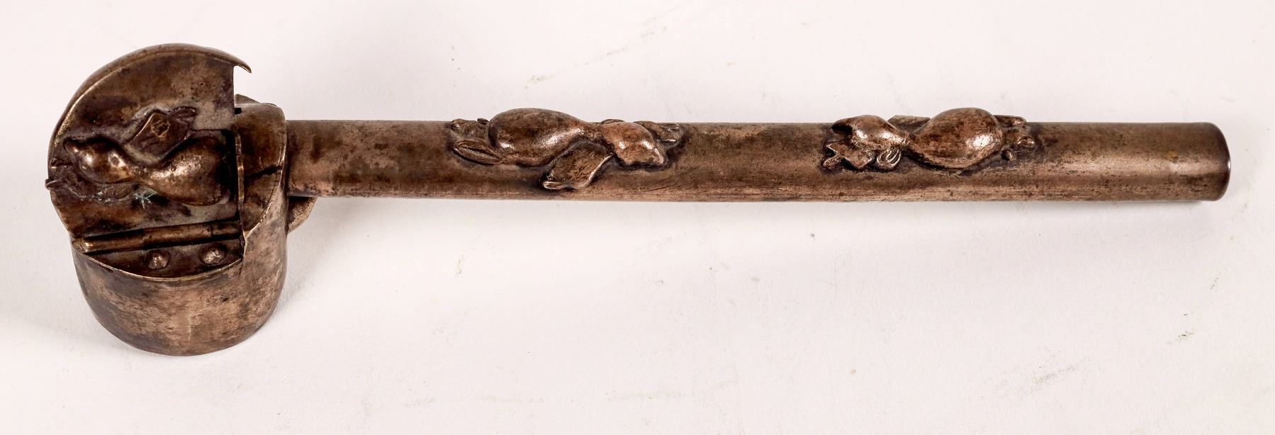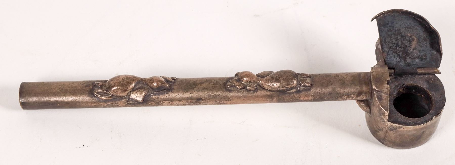 We have not seen a Chinese opium pipe like this. It is rare, silver plate on brass. Bowl has a hinged top with a partial duck? and 2 ducks on oval stem. 7.75" long.