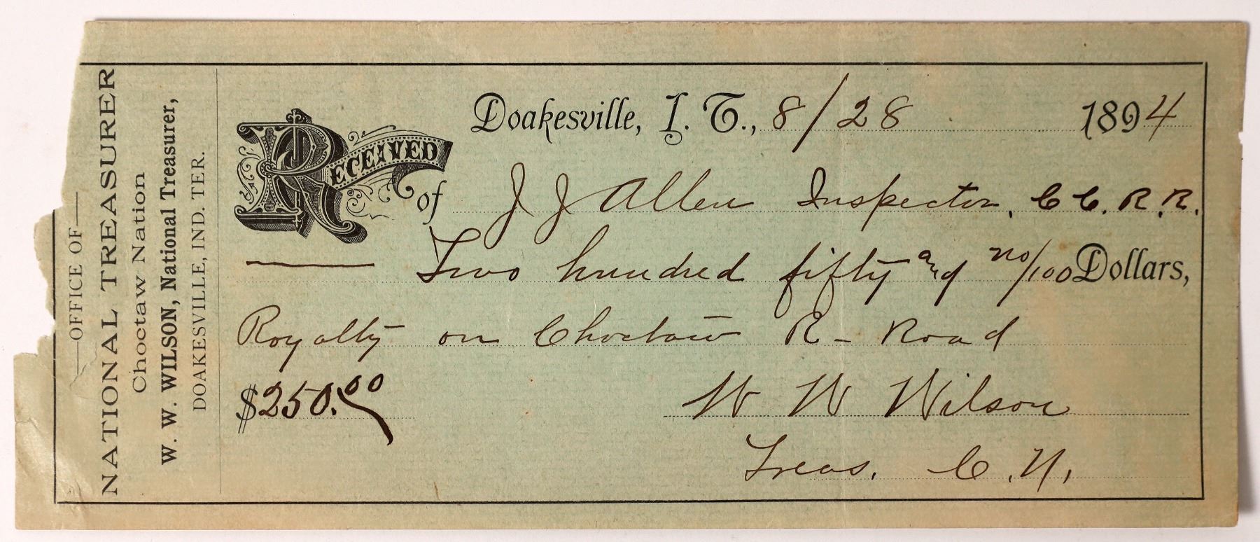 1897 receipt, Doaksville, IT. Signed by WW Wilson, National Treasurer.