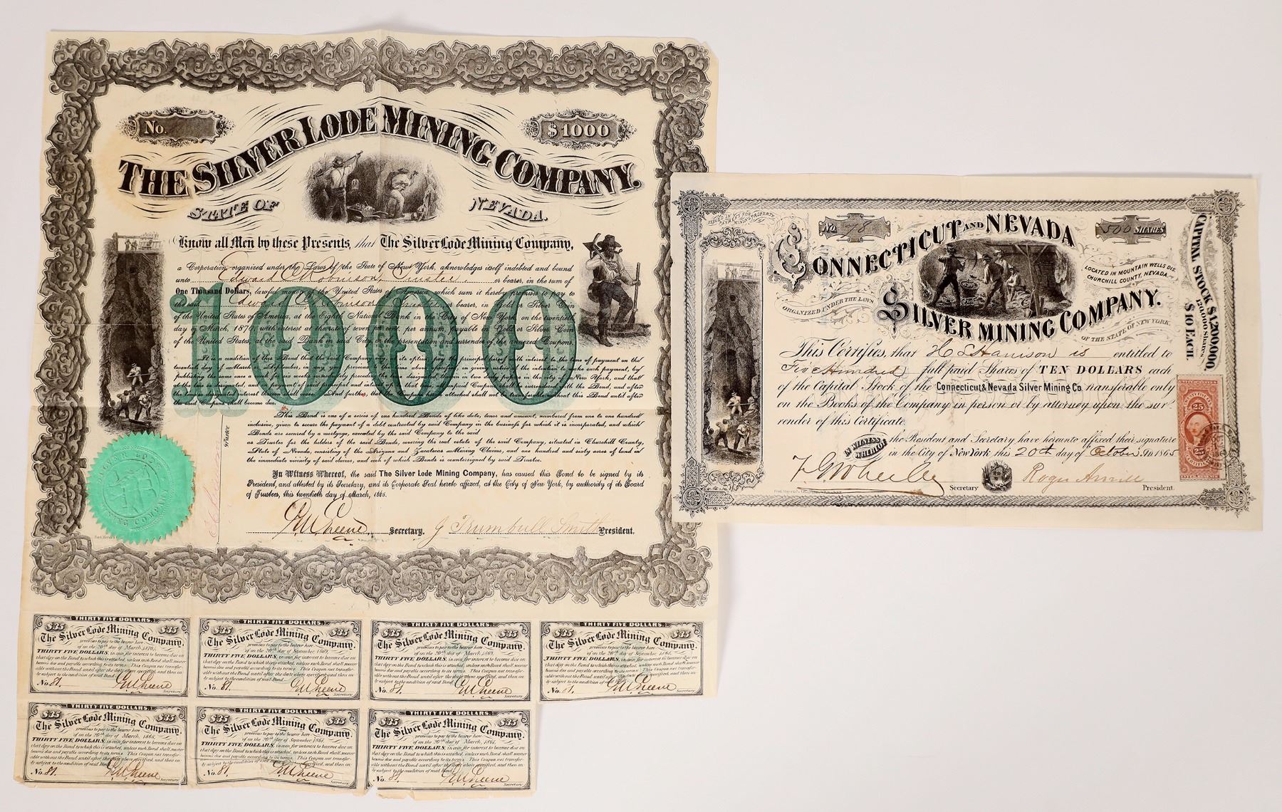 1) Connecticut & Nevada SMC Stock, located at the rare mining camp of Averill AND signed by president Averill!!! The mine owned the mining camp of Averill which was in the canyon below the county seat of La Plata, Churchill County. This certificate is signed by president Roger Averill, Lieutenant Governor of Connecticut. No coincidence here. # 78 for 500 shares to H. S. Harrison on October 20, 1865. Signed by secretary F. M. Wheeler(?) and president Roger Averill. Located in Mountain Wells district, Churchill County, Nevada. Issued in payment for mining property. 25c Certificate revenue stamp. Pre-stamped with circular October 14th stamp. Minor issues (nick top center, small tear bottom left), over all extremely nice! Two underground mining vignettes. Fred Mayer & Co., lithographer, New York. The Connecticut and Nevada had seven ledges and were working on three: the Satellite, Vermont and Washington. They had 2,000 feet of tunnels and shafts. Rock near the surface assayed at $30 to $135 and at one hundred and forty feet $1,500 a ton. The Mountain Wells district is usually referred to as the La Plata district. Includes more information on the mine, rare camp, and Averill.