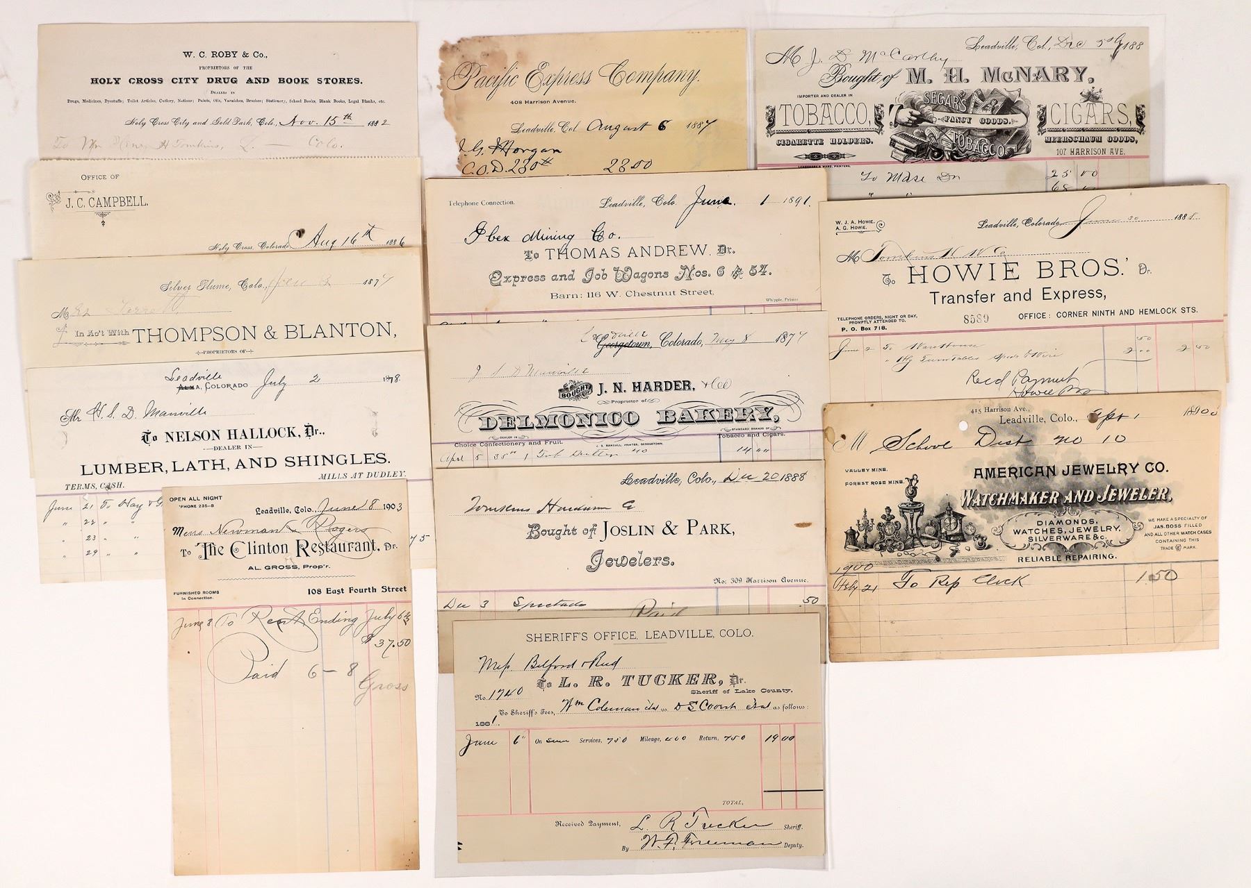 Lot of 14 different. Includes: extra rare WC Roby & Co. Holy Cross City Drug & Book Stores, 1882, letterhead, from Holy Cross City & Gold Park, Colorado (ghost town); JC Campbell letterhead, 1886, Holy Cross; Georgetown & Silver Plume Express Line & Pack Train billhead, Silver Plume, 1879; American Jewelry Co., Leadville, pictorial billhead, 1900; LR Tucker, Sheriff, Leadville, 1881; MH McNary Cigars, Leadville, pictorial, 1881; Joslin & Park Jewelers, Leadville, 1888; Demonico Bakery, Georgetown, 1879; Clinton Restaurant, Leadville, 1903; GL Wirth, Express Work, Leadville, 1888; Howie Bros. Express, Leadville, 1888; Thomas Andres Express, Leadville, 1891; Nelson Hallock Lumber, Alma (Leadville handwritten above), 1878; and Pacific Express Co., Leadville, 1887.