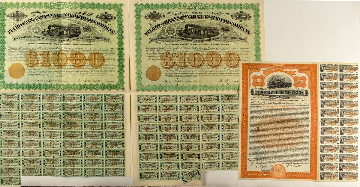 Lot of three from two companies. 1) Two $1,000 bonds for The Pueblo & Arkansas Valley Railroad Company, issued 1875 & 1878. Large, attractive bonds with large locomotive vignette and green border and background. Both are punch cancelled. 55 & 58 coupons attached. 2) $1,000 bond for The Denver & Rio Grande Western Railroad Company. Issued 1924. Punch cancelled. Orange border with train at depot vignette. Twenty-six coupons attached. (Prag Collection) City: State: Colorado Date: 1875-1924 hwac# 33903